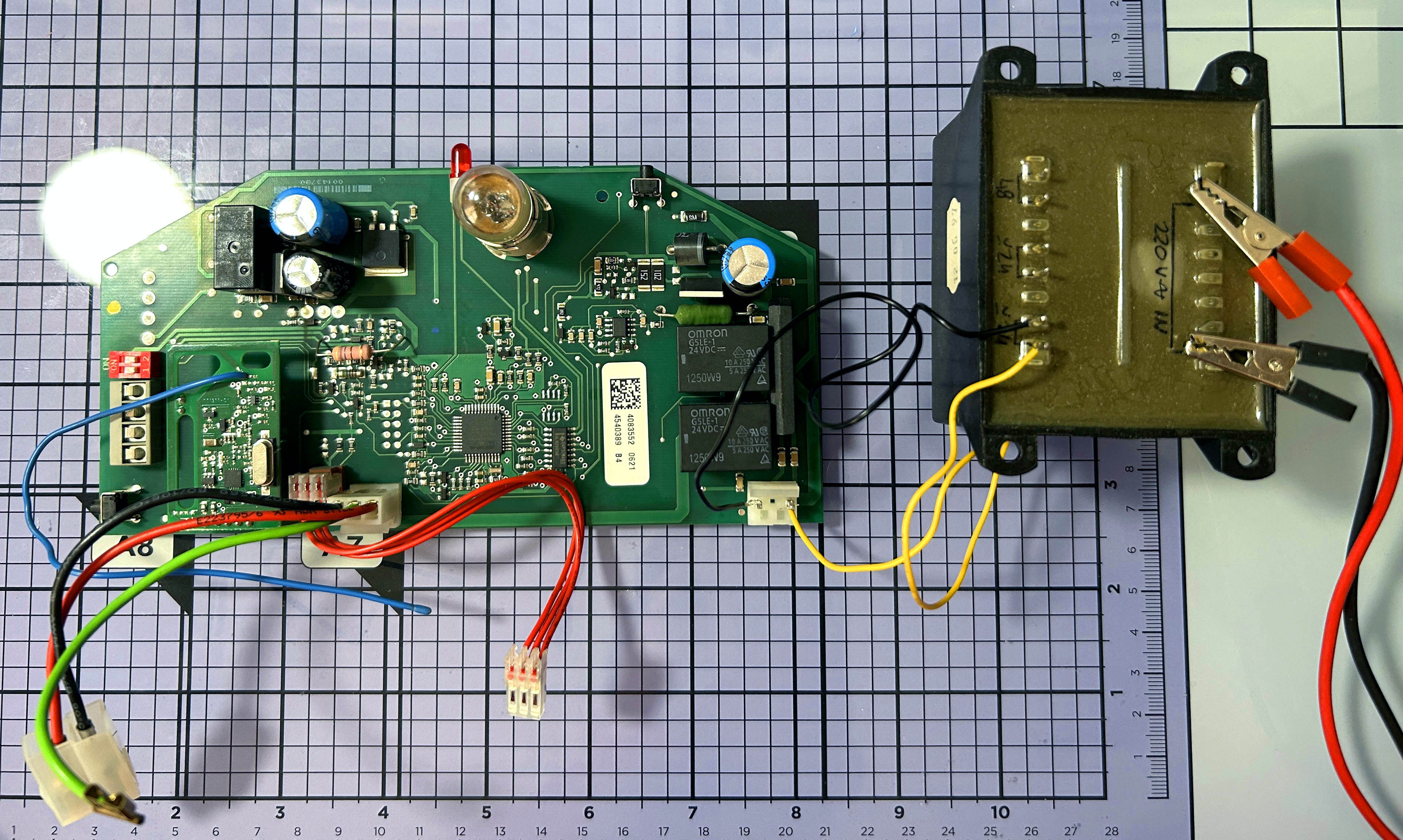 Centralita que comanda la puerta de un garaje. Al alimentar la placa no hay ningún síntoma de funcionamiento. Para probar he usado un transformador de 24V en alterna, ya que se alimenta con este tipo de tensión.