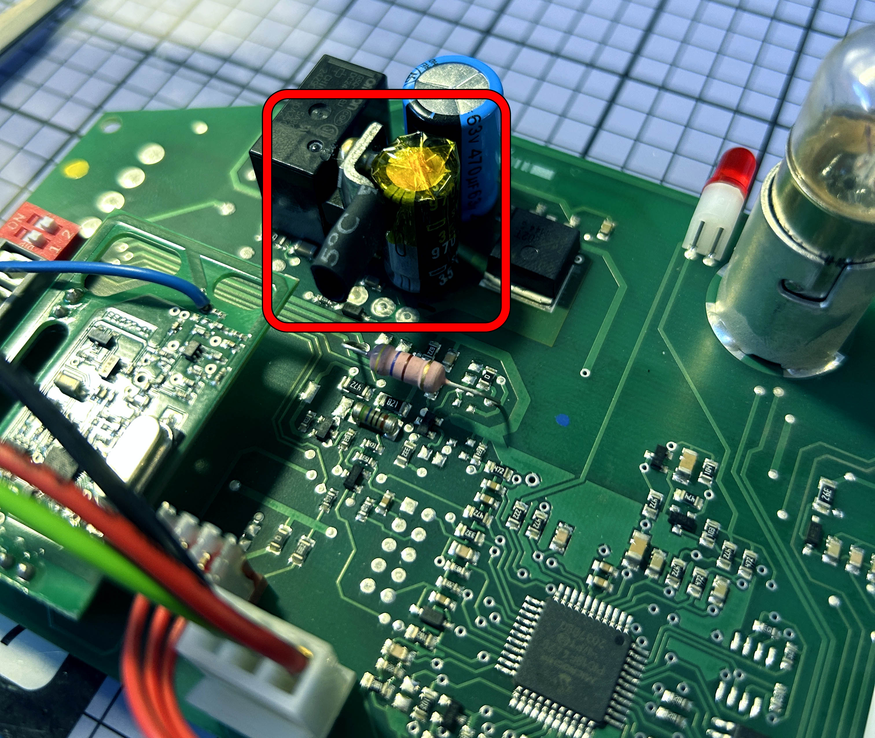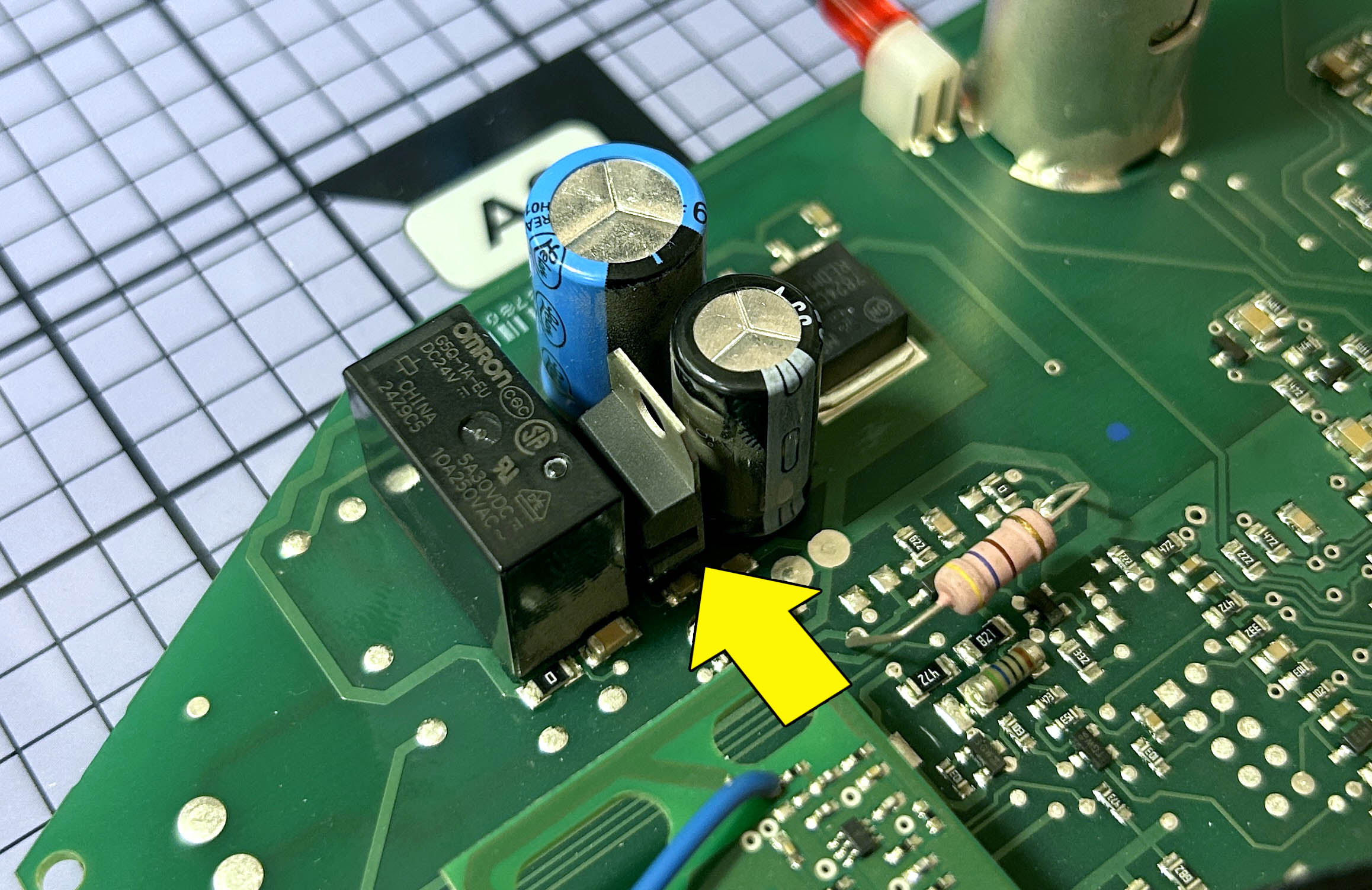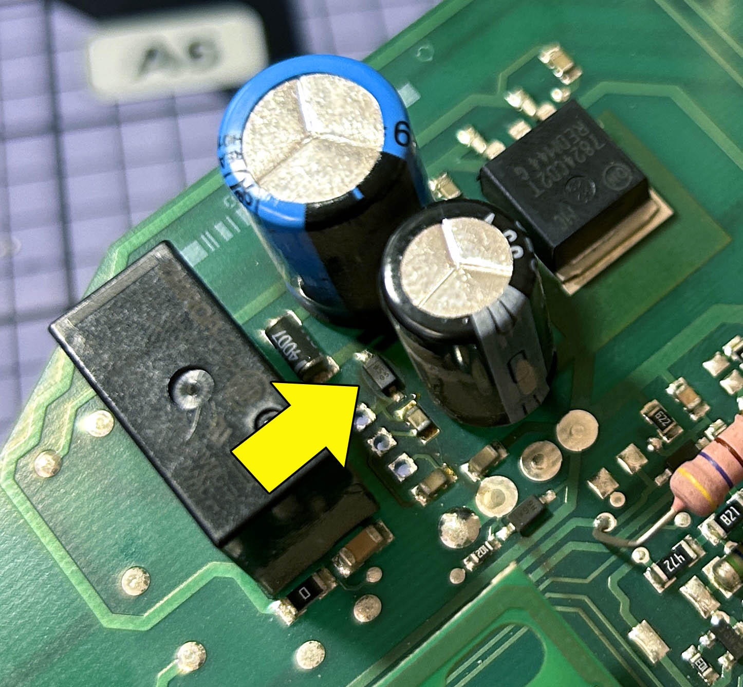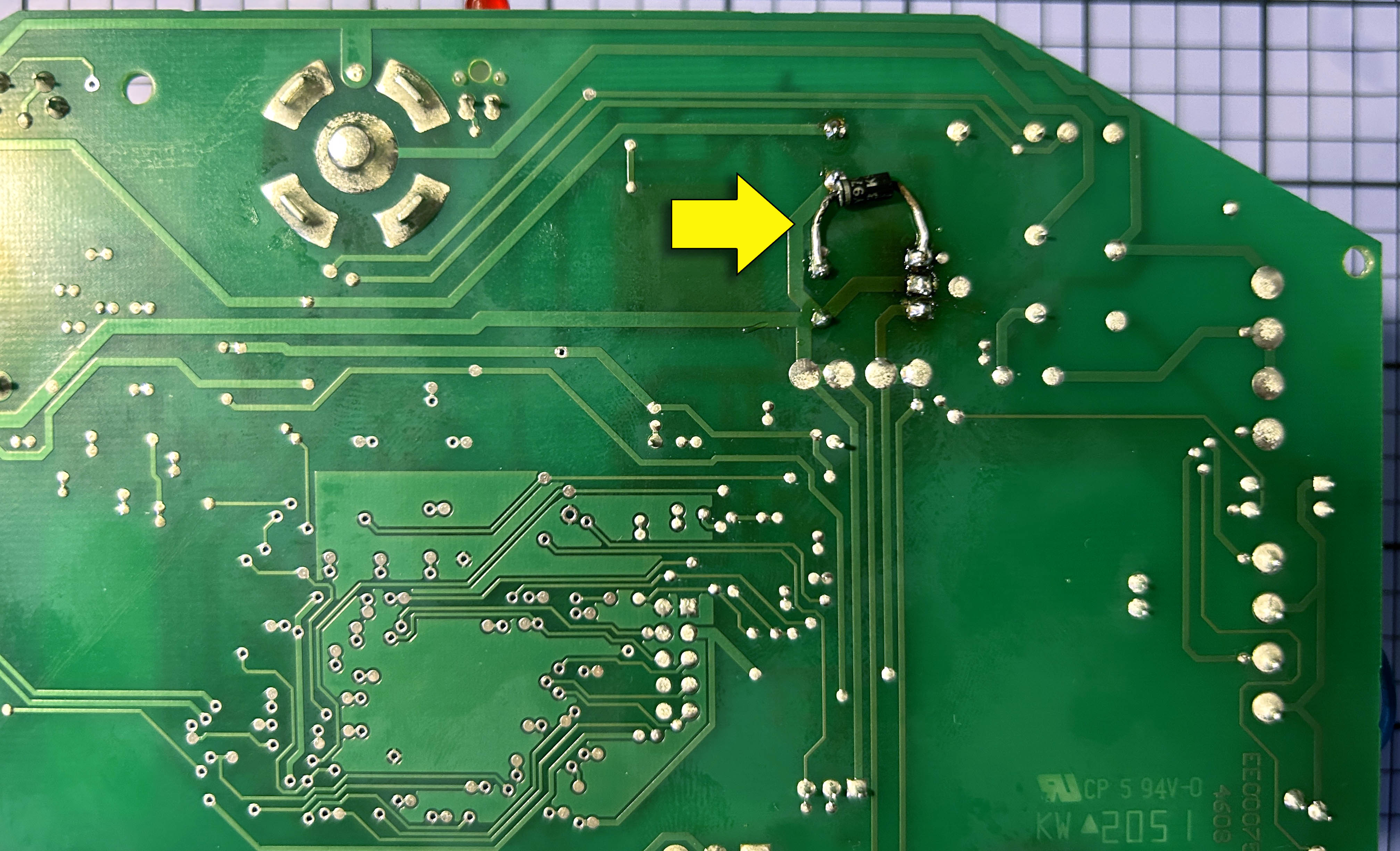 Afortunadamente el fabricante ha dispuesto un diodo polarizado en inversa en paralelo con la entrada de DC. Cuando la tensión tiene la polaridad correcta el diodo no conduce por estar en modo inverso. Cuando la polaridad está invertida, el diodo queda polarizado en modo directo y conduce, por lo que pone la fuente en corto y protege la circuitería. Veo que el diodo ha quedado dañado, por lo que lo substituiré por un 1N4007.