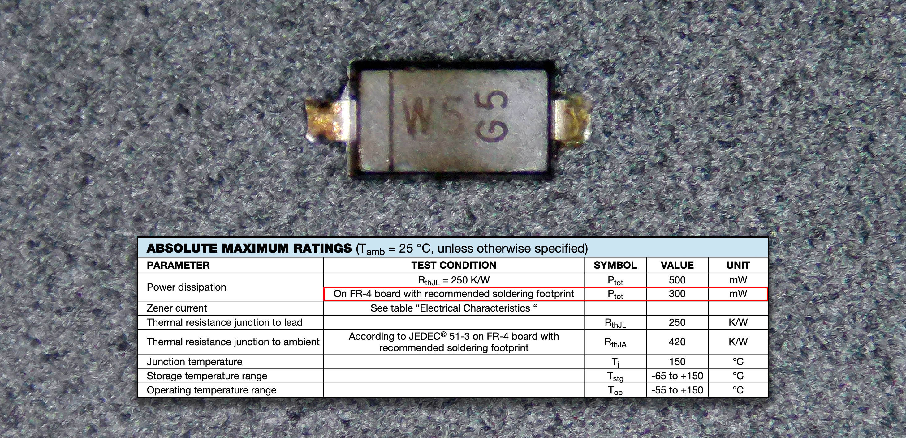 Observando la placa y aplicando ingeniería inversa por la falta de un esquema eléctrico, logro deducir cómo funciona la línea de alimentación de los 5V no presentes. El regulador de 24V se pasa por un diodo 1N4007, que tiene una caída de tensión de 0,7V. Su salida se lleva al diodo defectuoso, que está polarizado en inversa. Esto me hace sospechar que se trata de un Zéner. Buscando la referencia del encapsulado (W5) me encuentro con diferentes resultados, pero solo uno coincide con un Zéner. Se trata pues de un BTZ52C3V9.