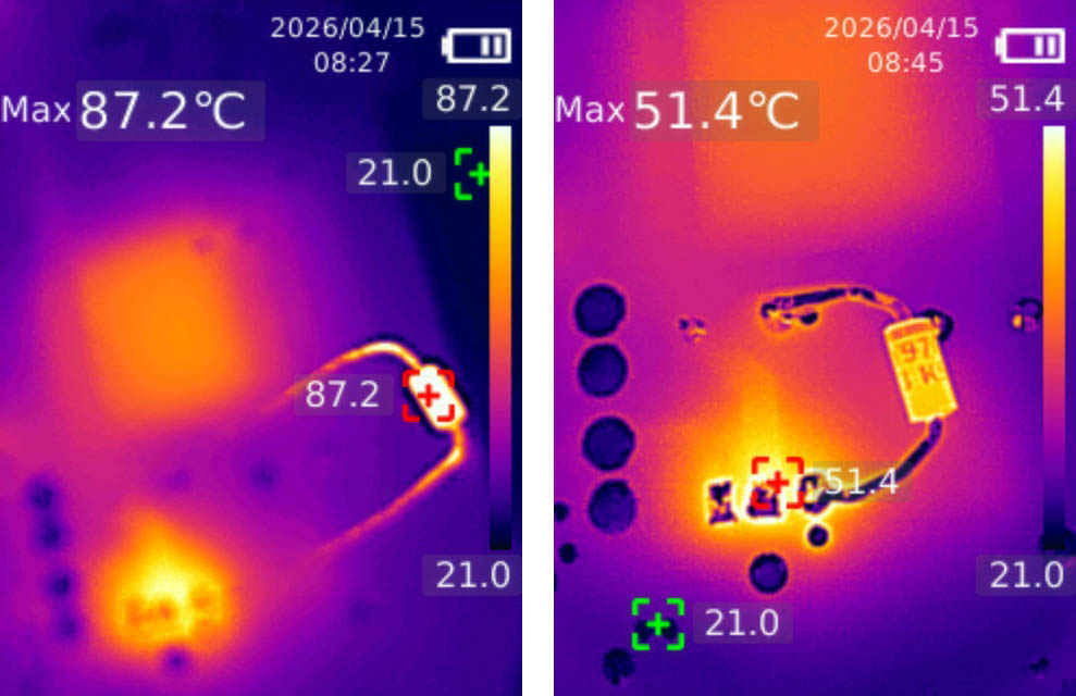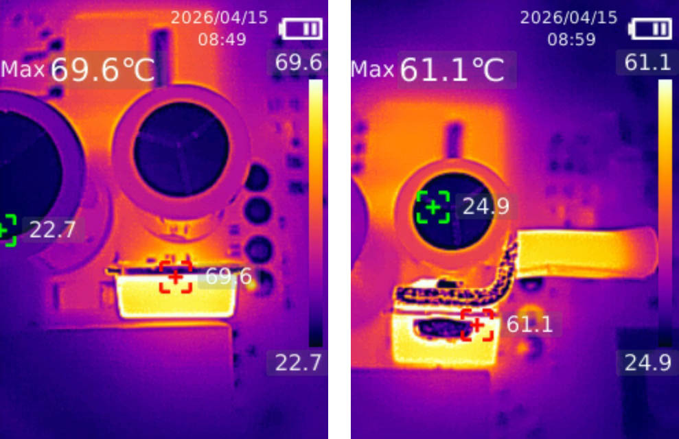 Monitorizando toda la zona con la cámara térmica para verificar la temperatura de trabajo del conjunto observo que el regulador 7805 llega a los 70ºC. Teniendo en cuenta que su temperatura máxima admisible es de 120ºC tampoco es exagerada, pero añadir un pequeño disipador rebajará unos grados dicha temperatura. Opto por acoplar una pequeña pieza metálica con pasta térmica y termoretráctil aislante para favorecer la disipación de calor. También añado cinta Kapton al condensador cercano para protegerlo de la radiación de calor adyacente.