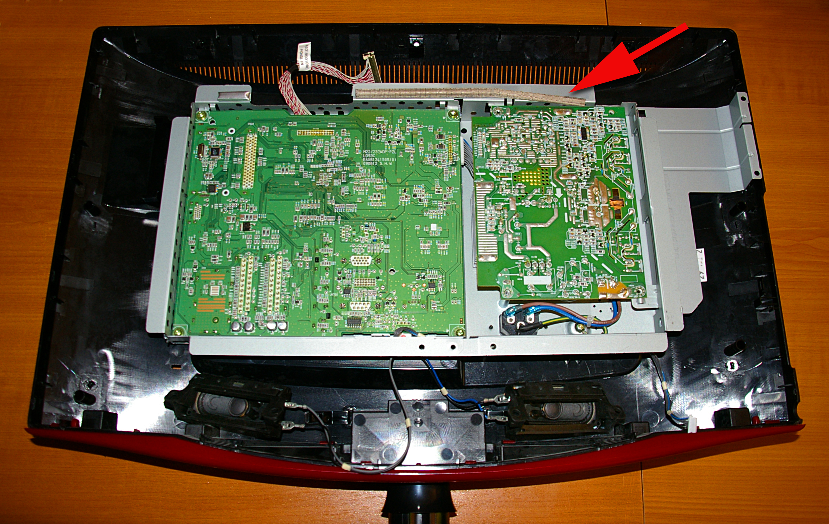 Tras montar todos los componentes compruebo que el televisor no enciende. Al no haber el más mínimo síntoma sospecho de la fuente de alimentación. Hay que desmontar todo para poder acceder a ella.