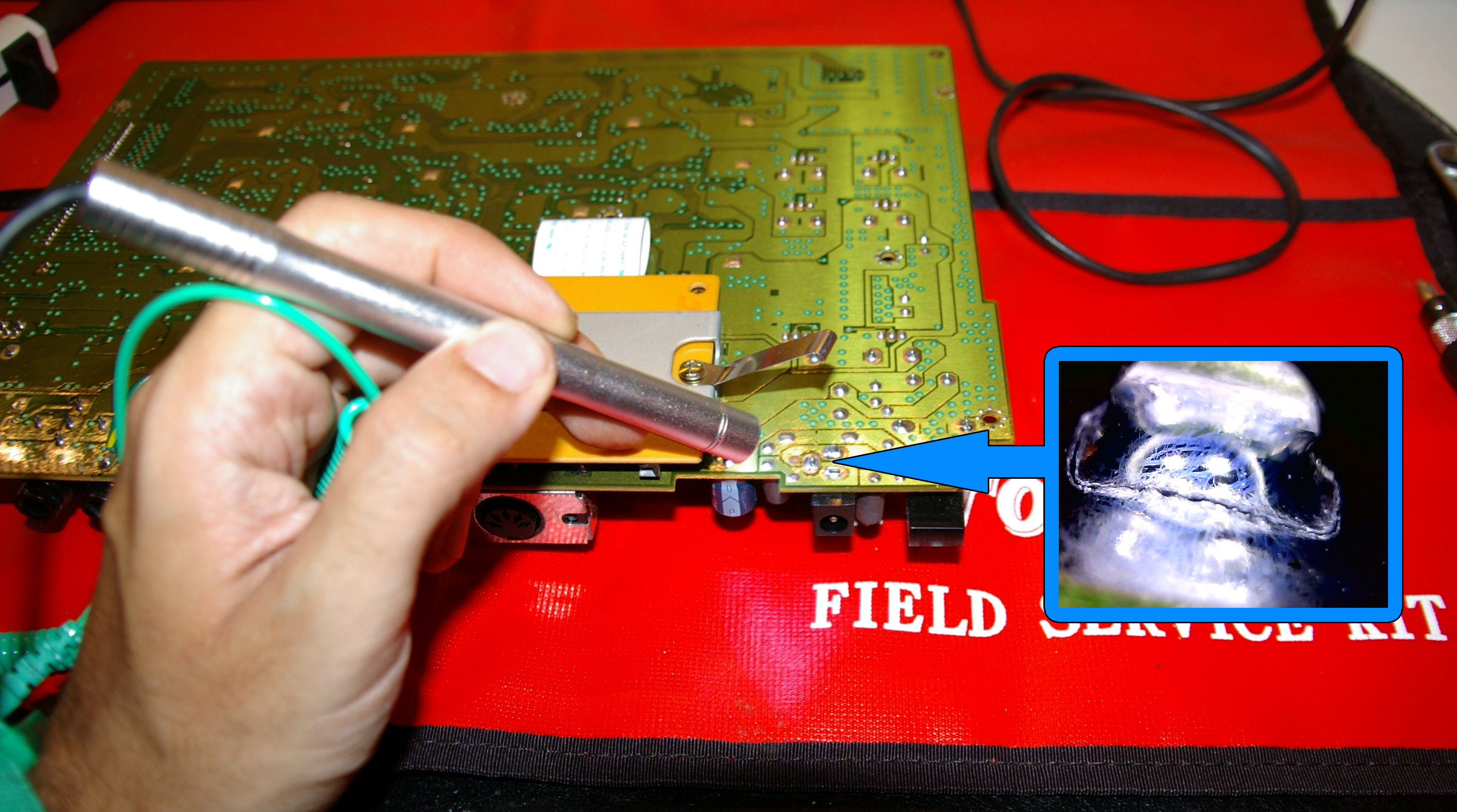 Una vez substituidos los cuatro conectores Jack inspecciono meticulosamente el equipo en busca de posibles futuros problemas. Gracias al microscopio electrónico localizo algunas soldaduras con grietas, lo cual generará con total seguridad un problema grave a muy corto plazo. Aprovechando que el equipo está abierto solucionaré estos inconvenientes para prevenir averías.