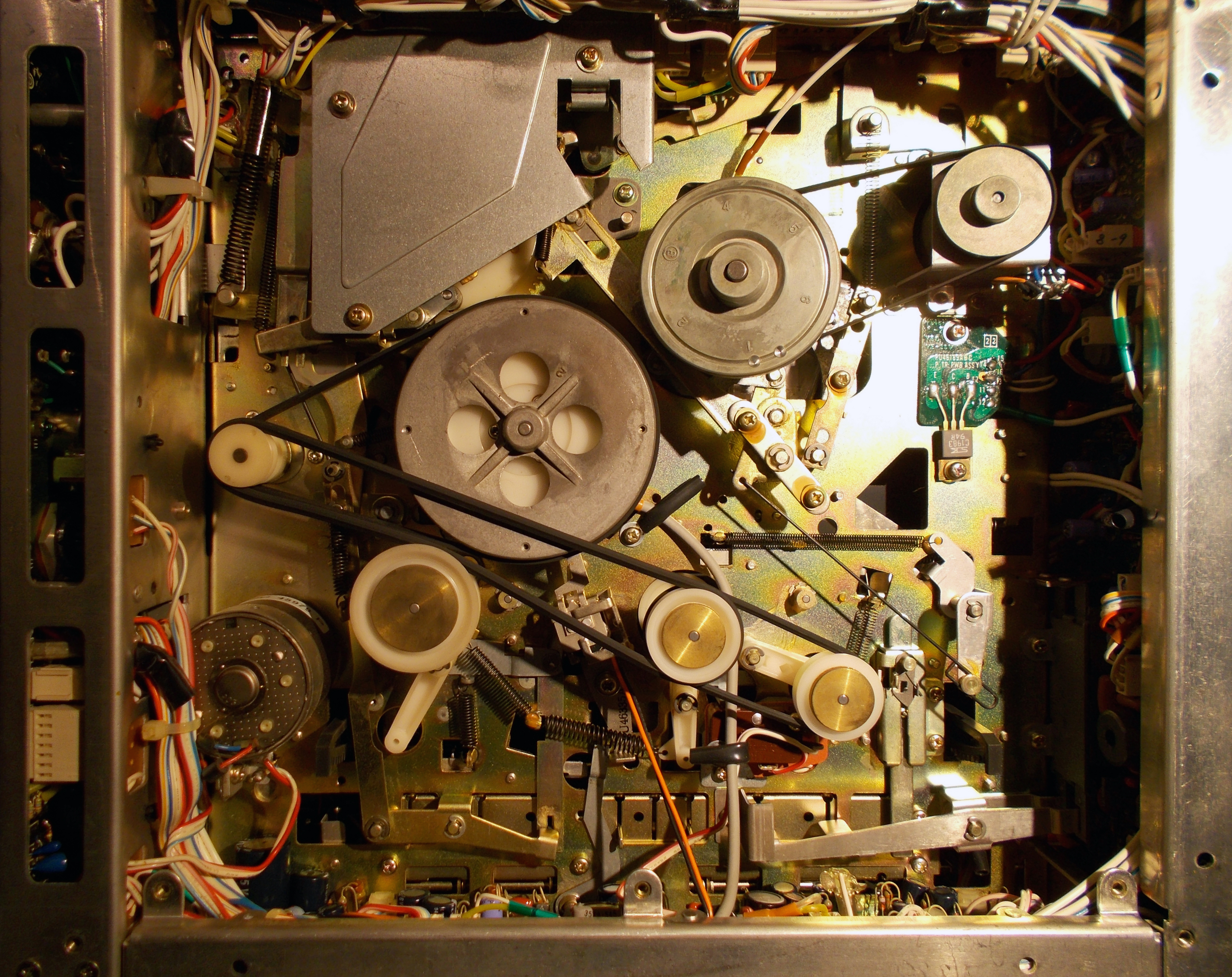 El chasis del HR-4100 es sencillo y muy robusto. Se trata de una mecánica concebida para trabajar en entornos duros, ya que su misión era la de acompañar a una cámara y registrar sus imágenes. El HR-4100 carece de motores paso a paso, incluso para mover el tambor de cabezales, como se aprecia en siguiente foto.