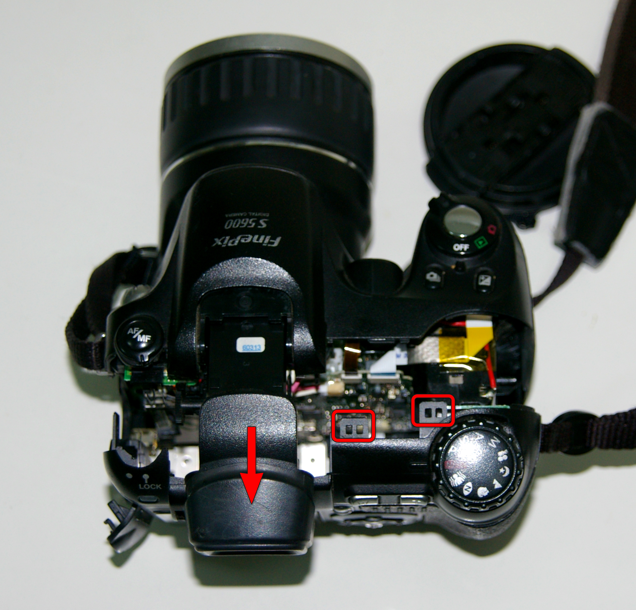Por último quito el tornillo señalado en la foto superior y desconecto el conector marcado con la flecha. Con esto puedo sacar el portapilas, en cuya parte superior se encuentra el botón de disparo. Al montarlo me tengo que asegurar de que el botón de encendido esté en OFF, para no dañar los interruptores SW902 y SW903.