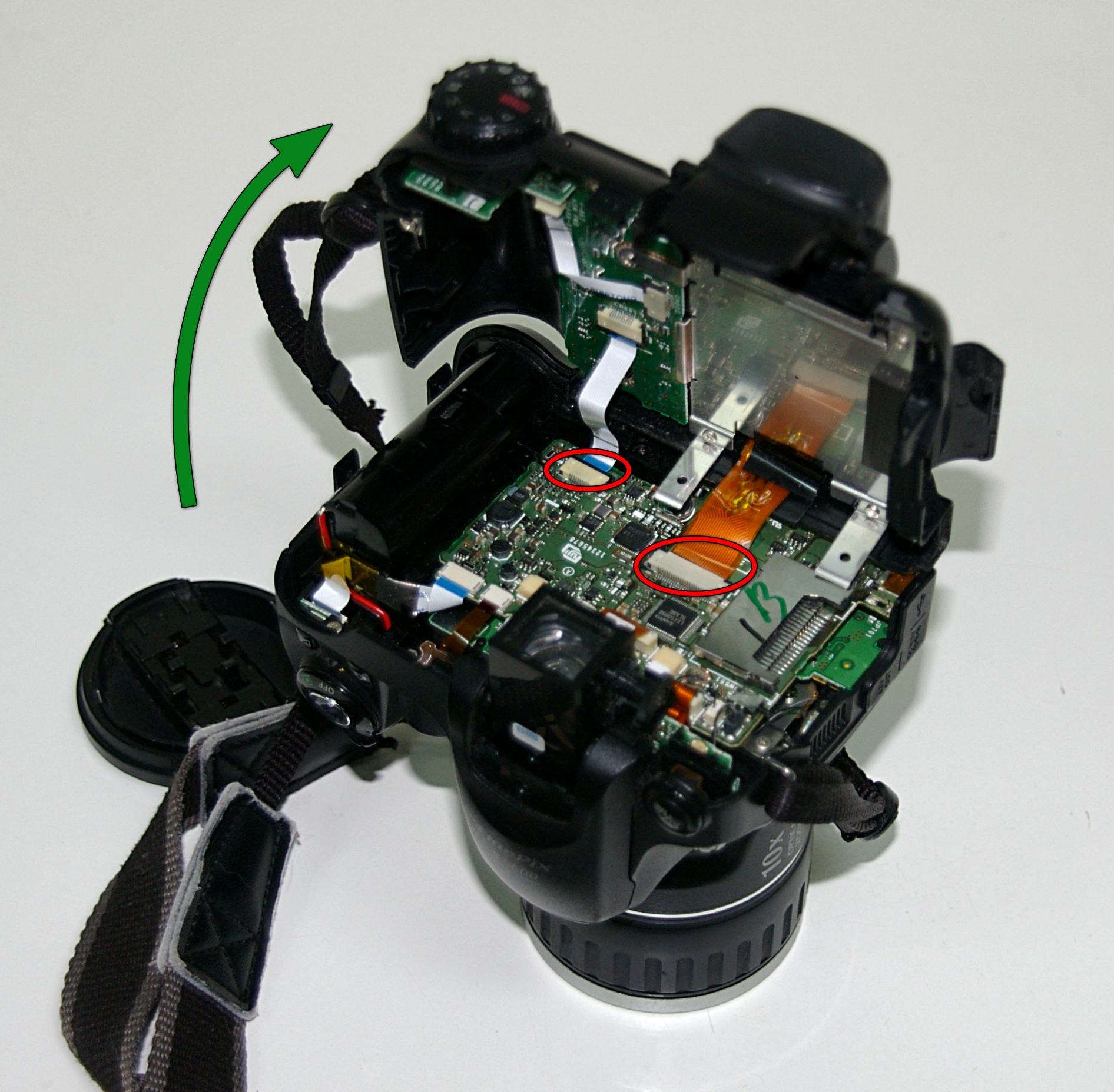 Apoyo la cámara sobre la óptica y abato el panel trasero en dirección de la flecha verde. Luego desconecto los dos cables que van a la placa del primer nivel y separo el panel. Al montar el panel hay que tener cuidado de la posición en que van las dos chapas inferiores, no deben tocar el circuito del primer nivel.