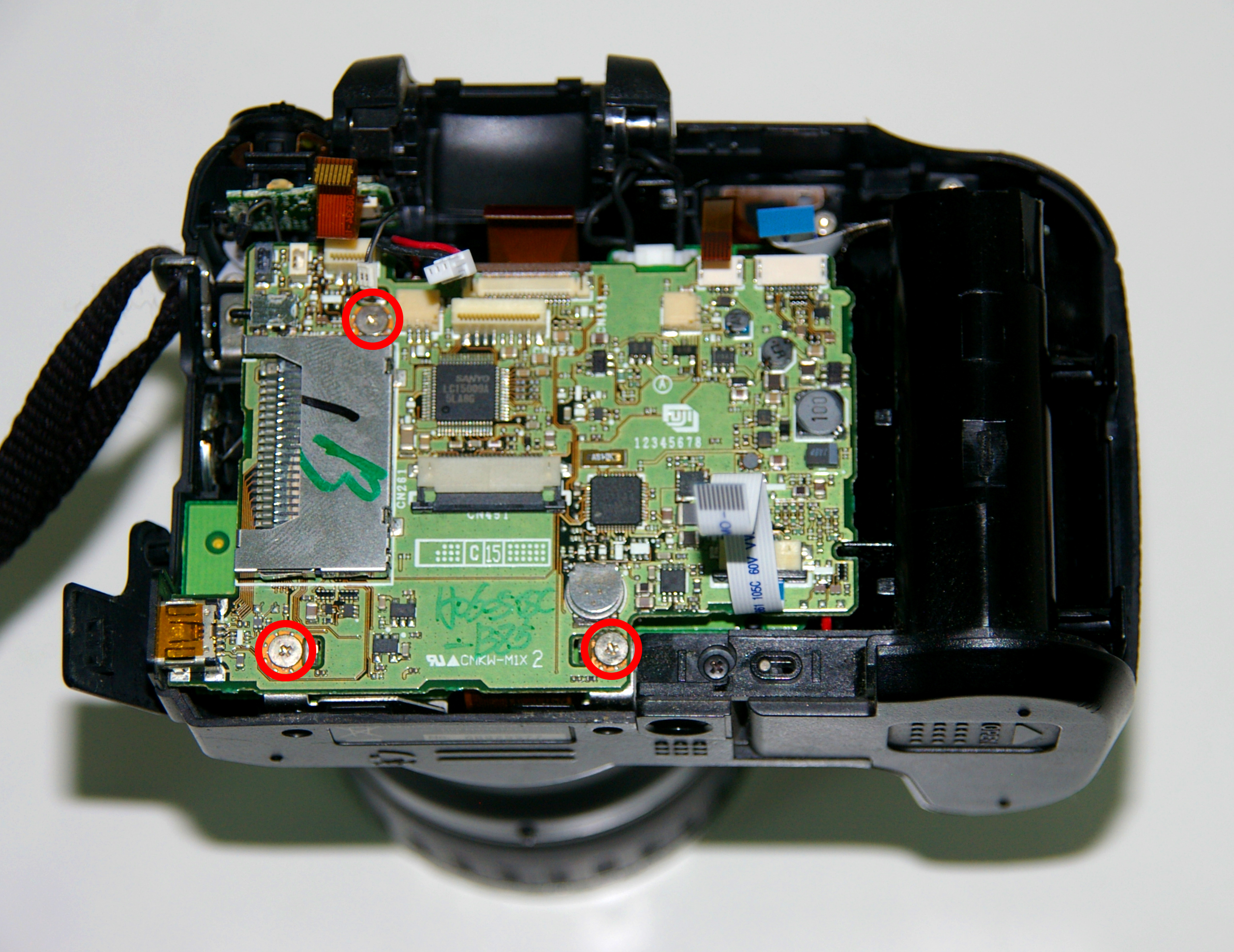 Para acceder al segundo nivel tengo que abatir dicha placa. Está unida a la placa del segundo nivel mediante un conector ubicado en el lado derecho, y más abajo del logo de Fuji. Haciendo palanca logro separar ambos circuitos y puedo abatir el del primer nivel. Lo hago en dirección hacia abajo. es decir, el lado que queda en la base de la cámara actuaría de «bisagra», como se ve en la foto inferior.