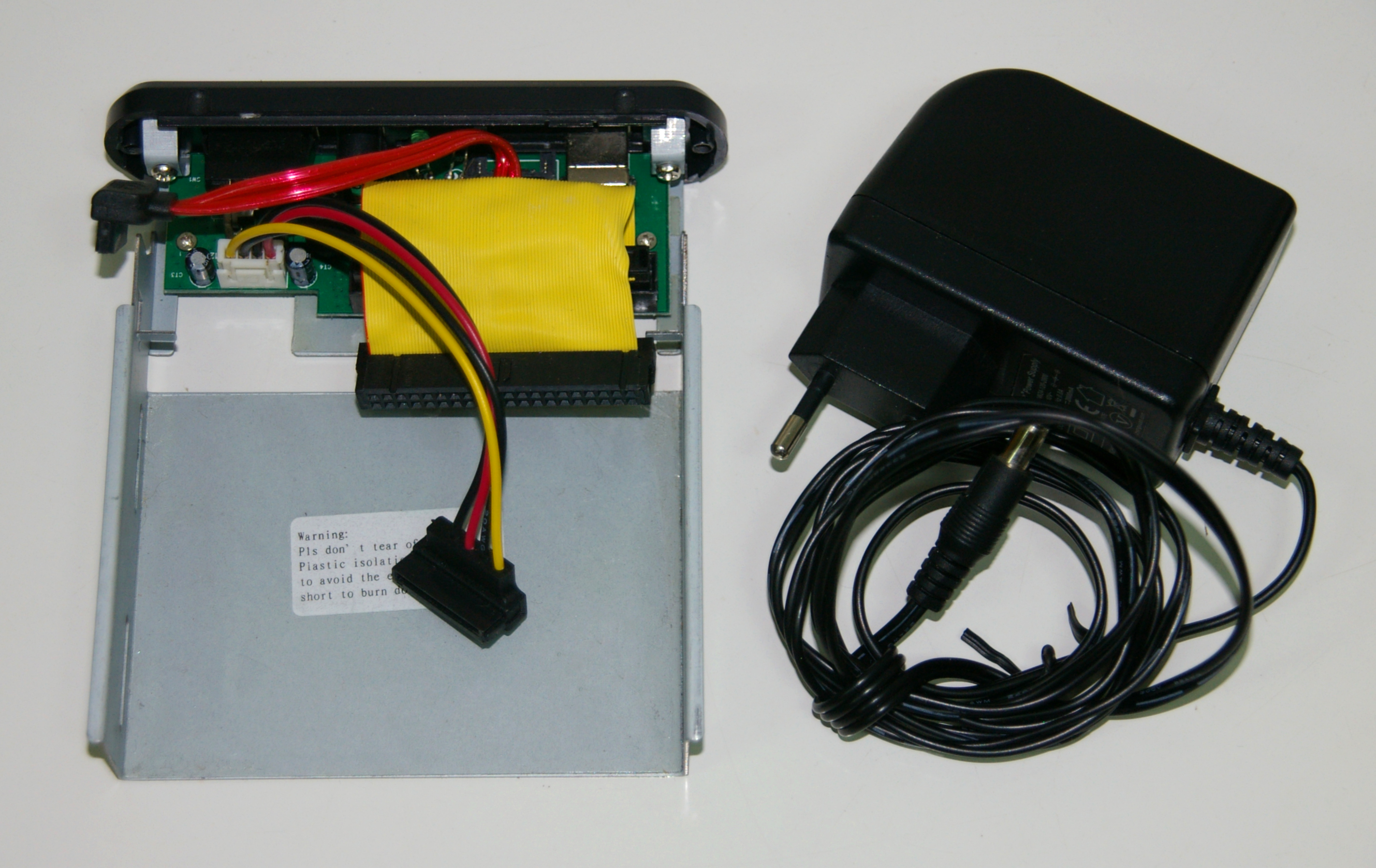 Una vez hecho esto preparo la alimentación de la placa del disco duro, usando una caja externa Serial ATA, de la cual utilizo solamente el conector de alimentación. Aún no alimento la placa del disco duro. Lo haré justo antes de arrancar la aplicación PuTTY.