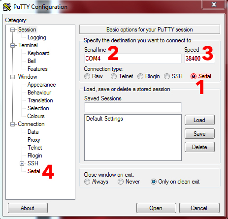 Serial Line: COM4 (el puerto al que he visto que está conectado el conversor USB-UART).