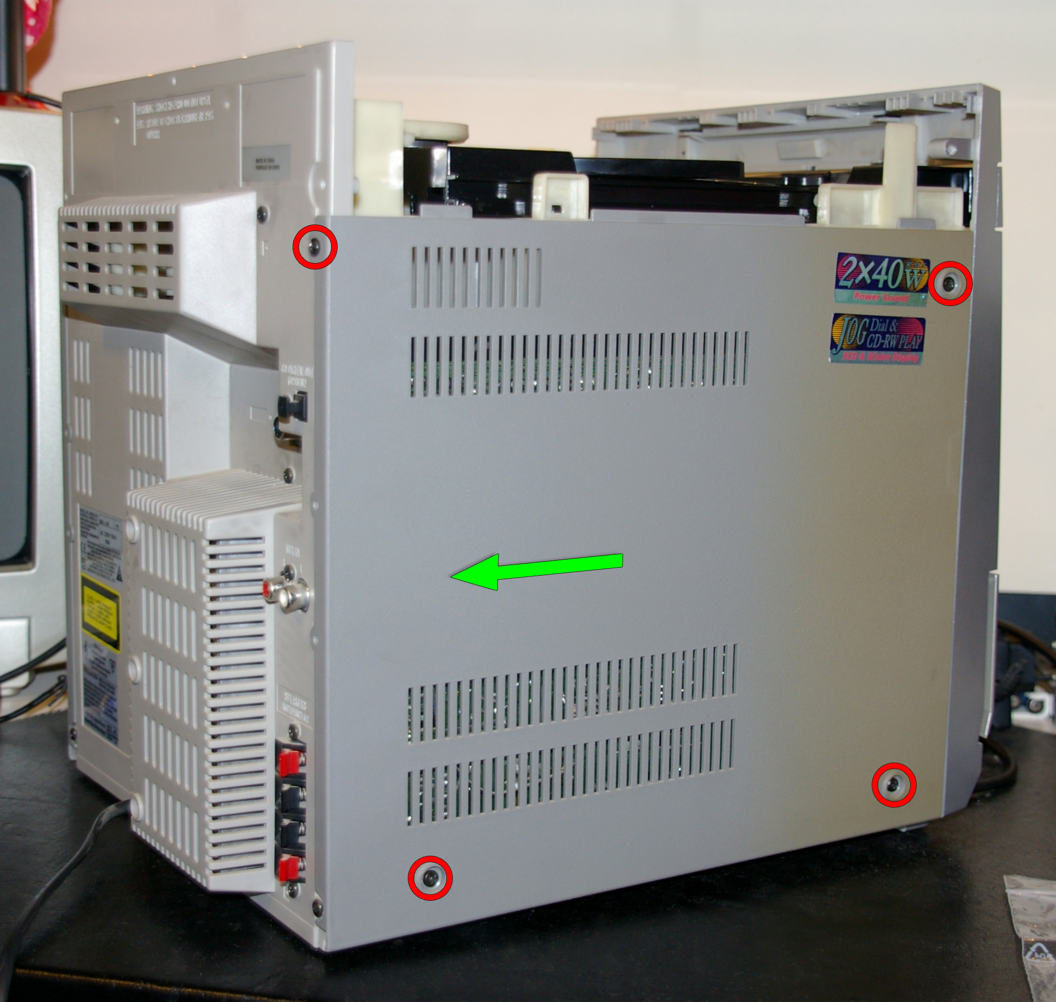 Seguramente se debe a la rotura de una correa, ya que se escucha el motor que acciona la bandeja pero esta no se mueve. Tengo que abrirlo. Lo primero es extraer la tapa superior. Para ello saco los cinco tornillos que tiene, dos laterales y tres traseros. Luego levanto desde atrás y saco la tapa.