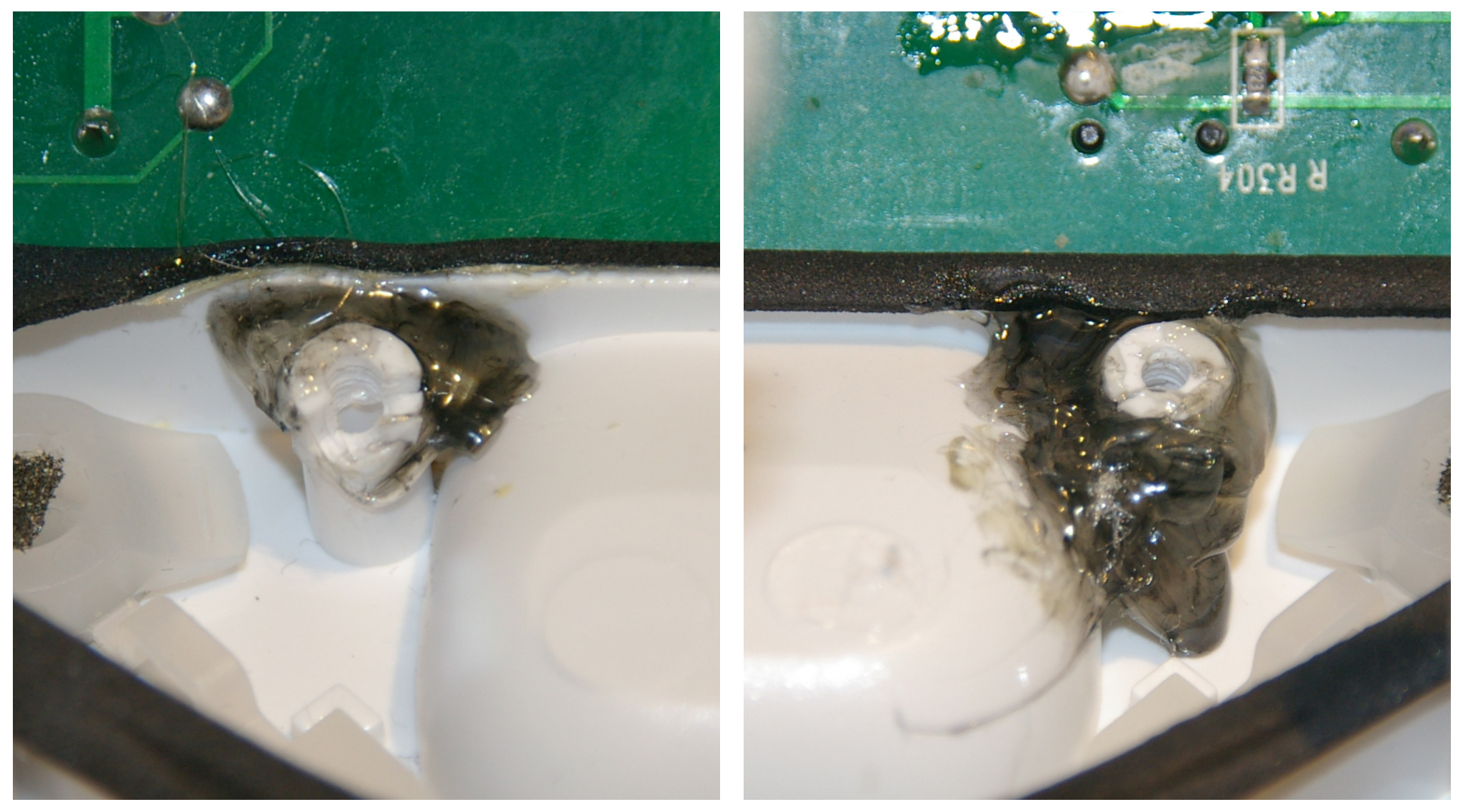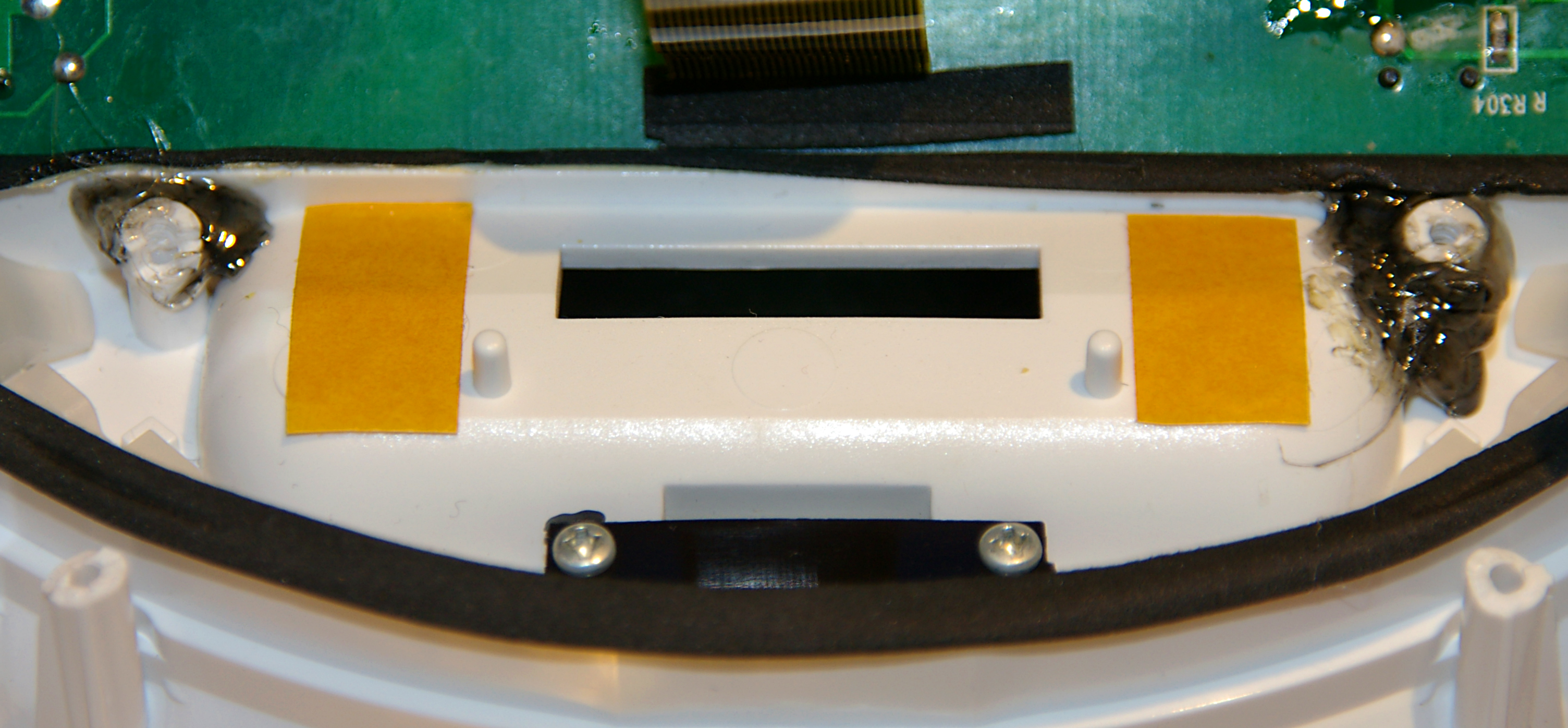 He aquí otra vista, esta vez de la placa del zócalo Dock, en el que se ven restos del plástico partido, que ha quedado enganchado en las espiras de los tornillos.
