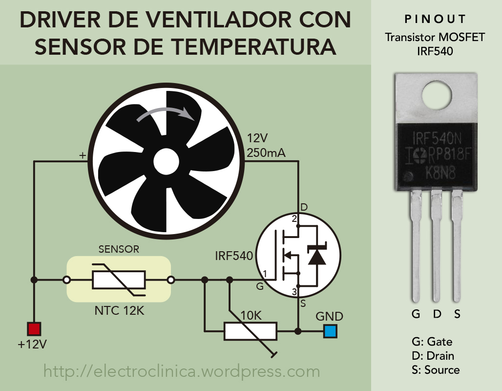 El driver utiliza un transistor MOSFET IRF540 para su funcionamiento, en cuya puerta se ha colocado una resistencia NTC que hace de sensor.
