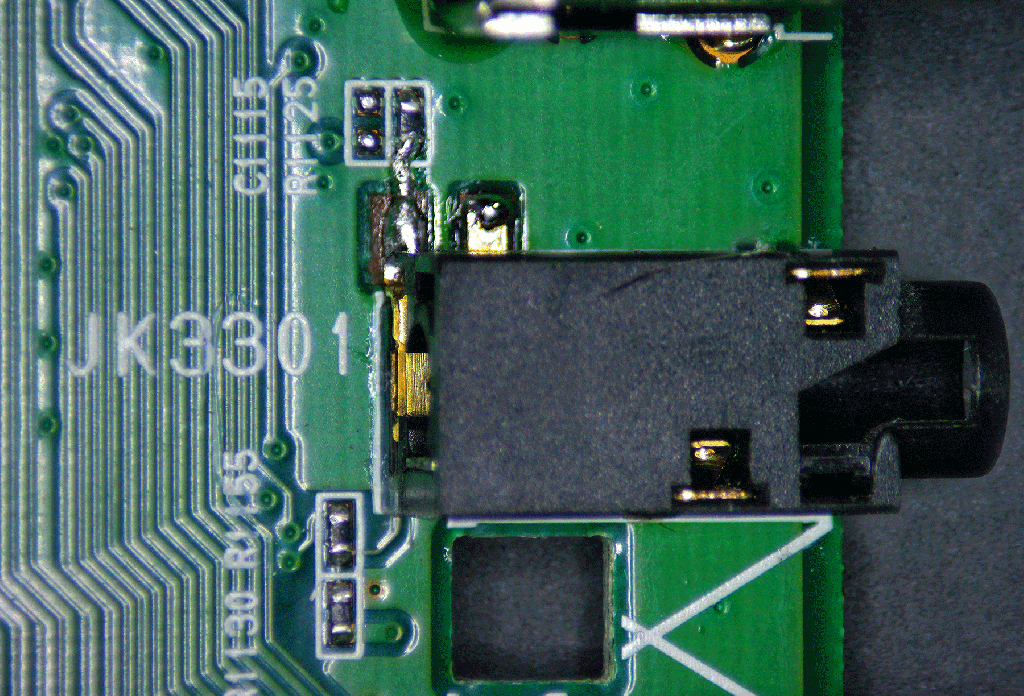 A continuación saco lateralmente el plástico embellecedor de los conectores y veo la zona de la que se ha desprendido el conector de auriculares, el cual encuentro suelto dentro del televisor. Los pads de soldadura están arrancados, por lo que se tendrán que puentear para recuperar el contacto.