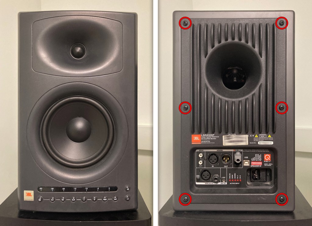 Monitor de estudio JBL 4326P y tornillería a extraer para su apertura