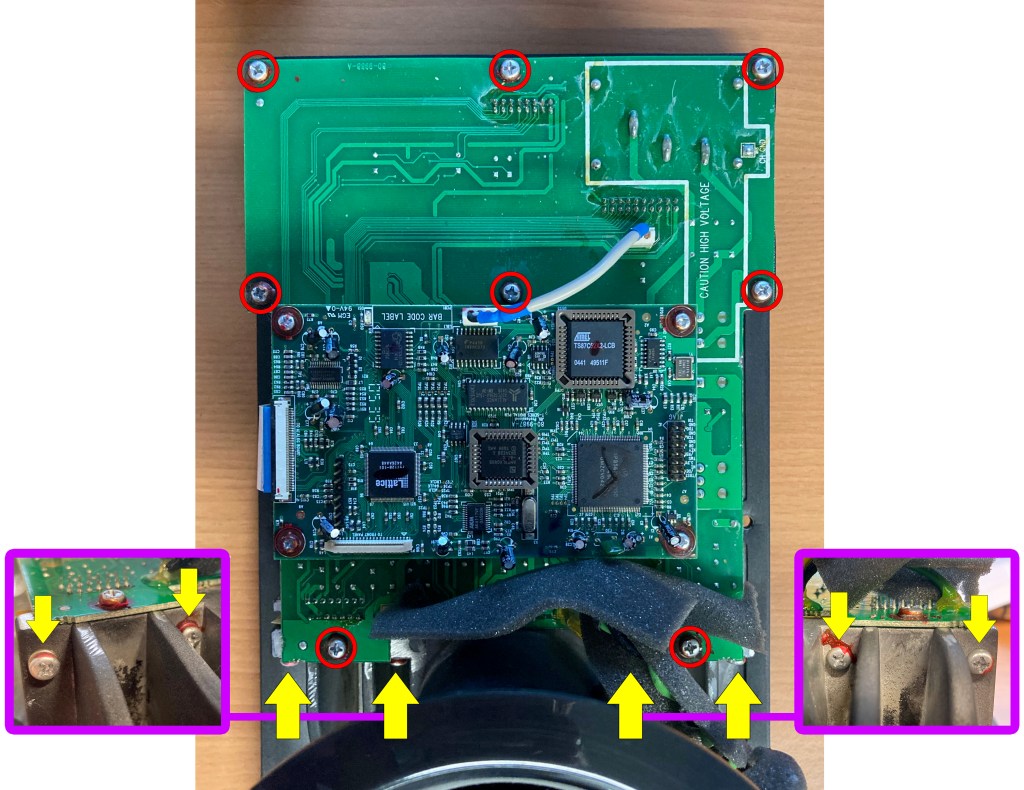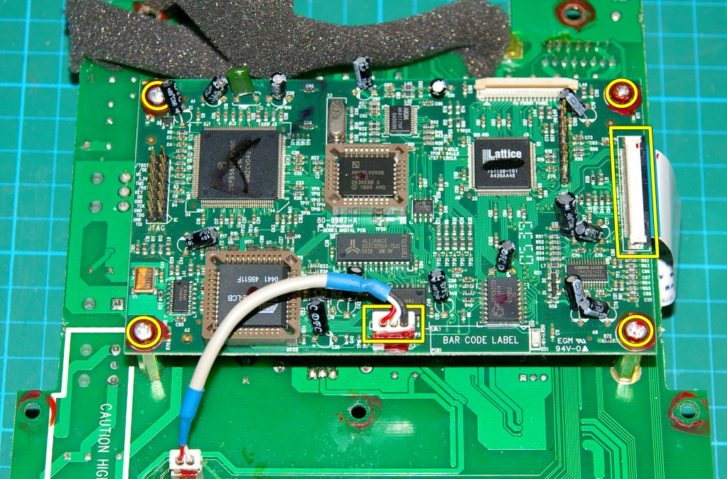 Una vez fuera la circuitería tengo que sacar la placa digital, ya que algunas de las soldaduras no están accesibles sin desmontarla. Procedo quitando los 4 tornillos marcados y desconectando los cables indicados en la imagen siguiente.
