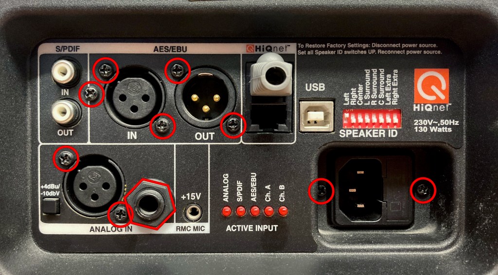 Los altavoces JBL LSR4326P son unos monitores de estudio profesionales con una respuesta extremadamente lineal, y que pueden configurarse como sistema Surround. Una de las unidades ha quedado en Standby y no enciende. Para comprobar qué ocurre procederé a abrir el equipo averiado. Tras desconectarlo quito los 6 tornillos del panel trasero para acceder al interior.