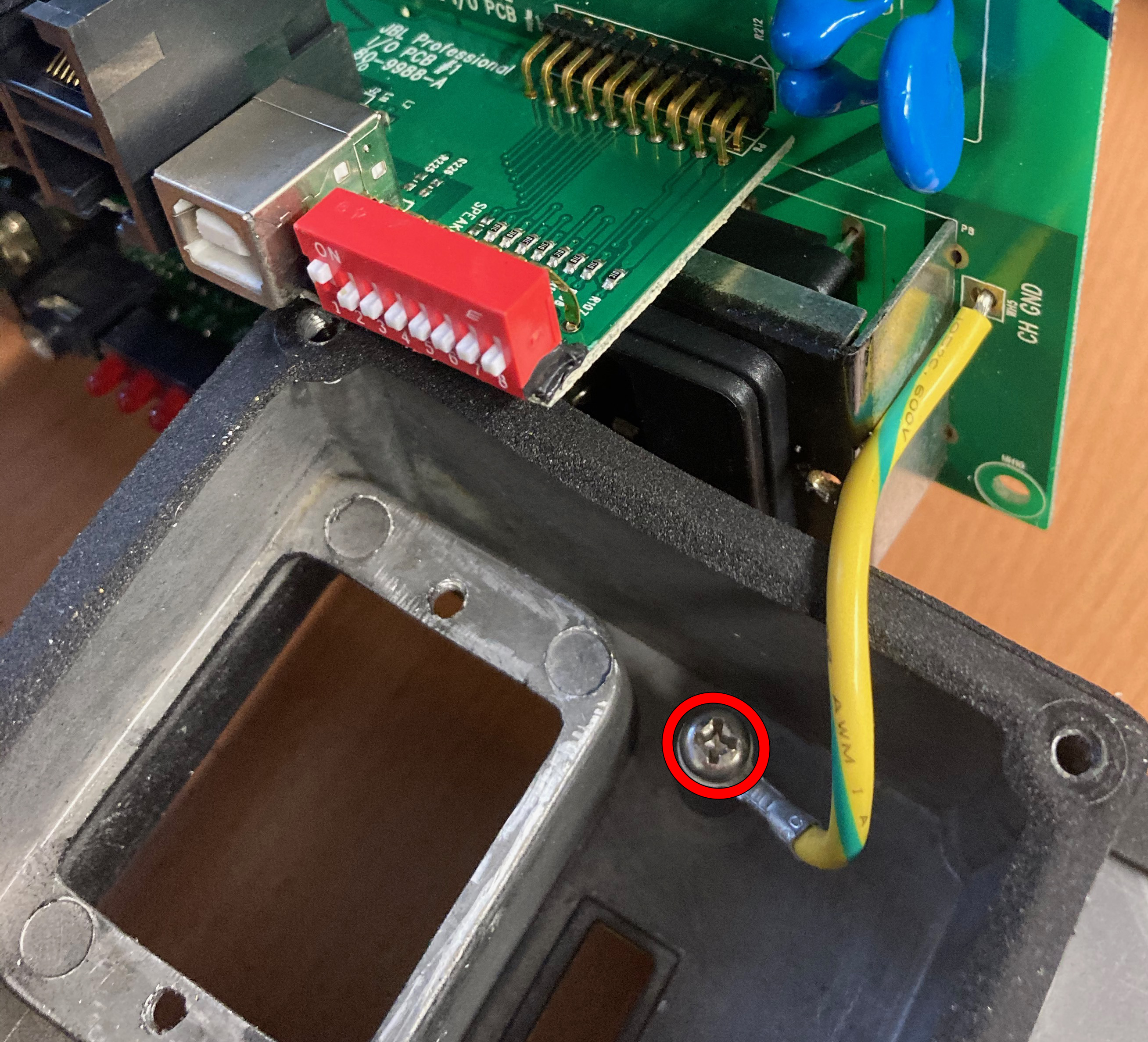 Con esto la circuitería queda liberada y la puedo extraer sin dificultades. Al levantarla tengo acceso al tornillo de la toma de tierra. Lo quito.