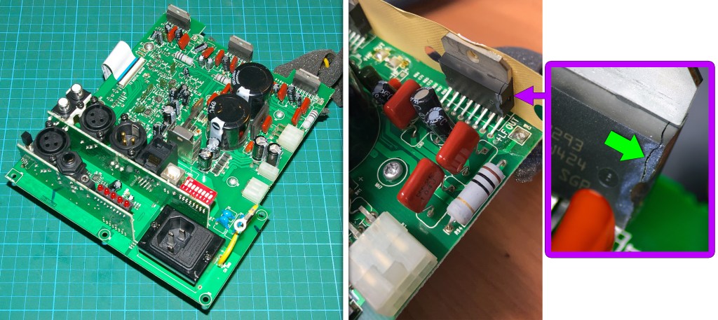 Con la placa analógica ya accesible veo un integrado TDA7293 con una profunda grieta. Hay que substituirlo (ver al final un truco para hacerlo).