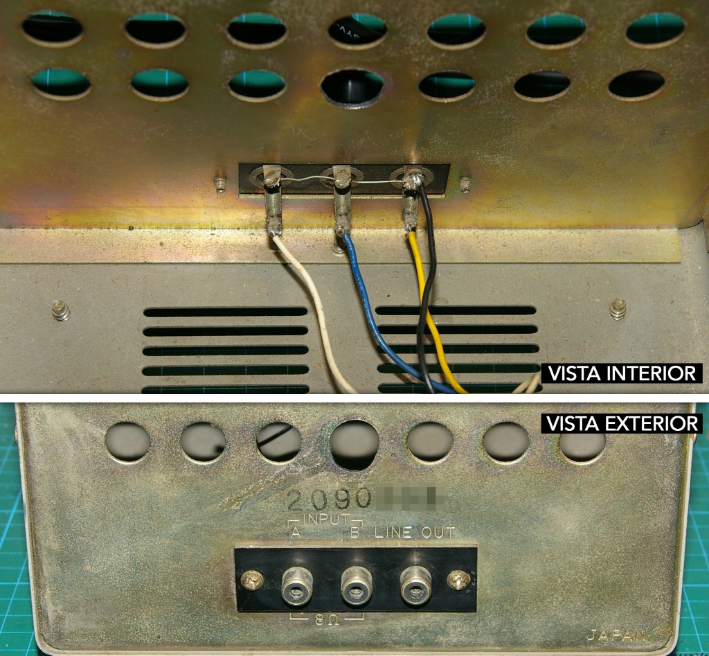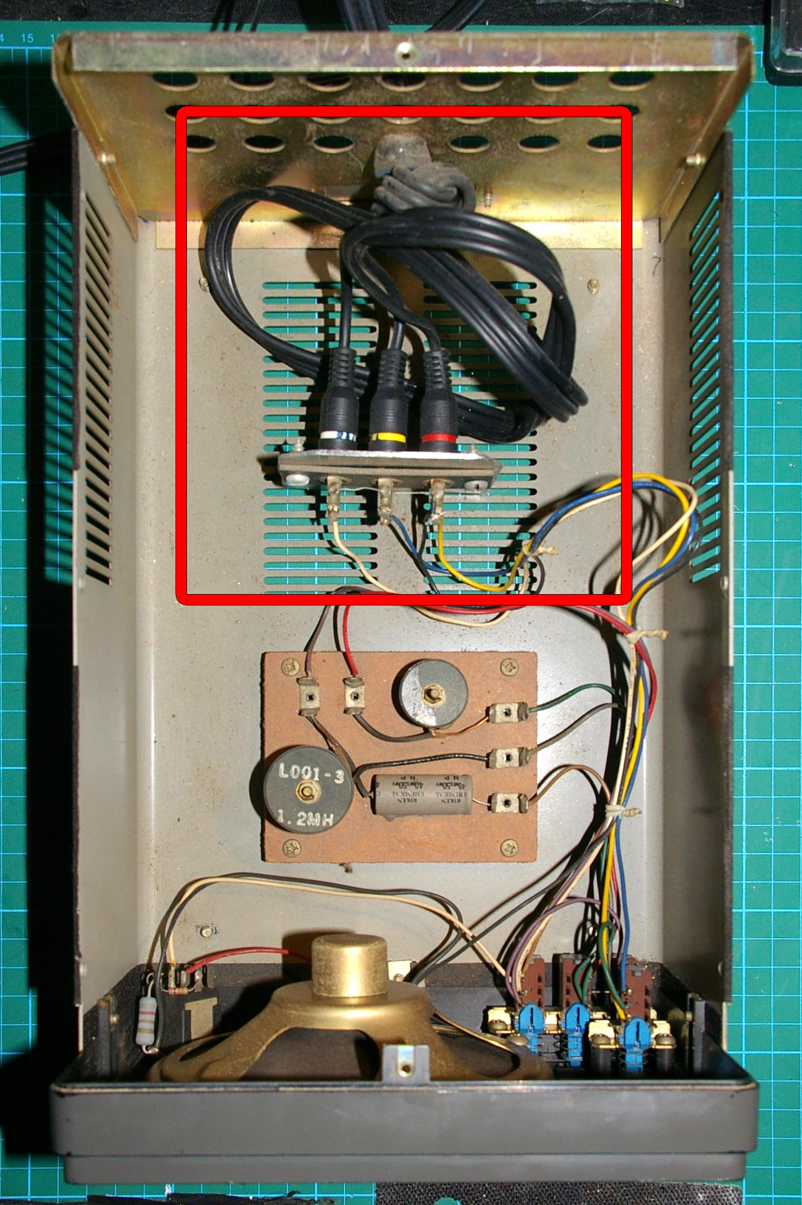 Abro el equipo quitando los 8 tornillos de la tapa superior. Al retirarla compruebo que la modificación realizada es no invasiva. El panel posterior original se encuentra dentro de la unidad, colocado en una chapa de aluminio. A él han conectado un cable de audio con conectores RCA, que han sacado al exterior por uno de los orificios traseros del chasis.