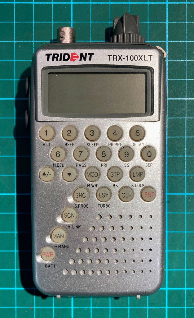 El Trident TRX-100XLT es un receptor de banda corrida que abarca desde 100KHz a 2,2GHz. Esta unidad en concreto no enciende, aunque el portapilas está en buenas condiciones, por lo que descarto un mal contacto de las pilas.