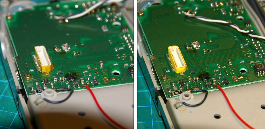 Al abrir descubro rápidamente el problema. El conector PCB-to-PCB hembra está roto. Tiene dos fisuras que han hecho que se abra, perdiendo presión e impidiendo el contacto entre la placa del frontal y la de control. En la siguiente foto se pueden ver las fisuras, aunque la tomé después de corregir la separación entre ambos lados del conector.