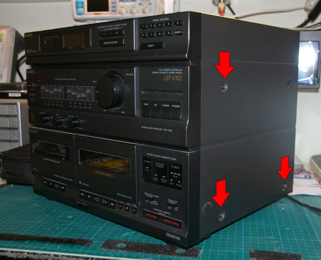 Anteriormente ya hice una reparación de este equipo HiFi Sony LBT-V302, y en esta ocasión se trata de un problema con el canal derecho. Ni en el altavoz ni en los auriculares tengo un buen nivel de audio. Para equilibrar el sonido tengo que poner el balance casi a tope a la derecha. El fallo es intermitente, siendo el nivel de audio del canal «R» variable, pero en ningún caso adquiere un volumen aceptable.