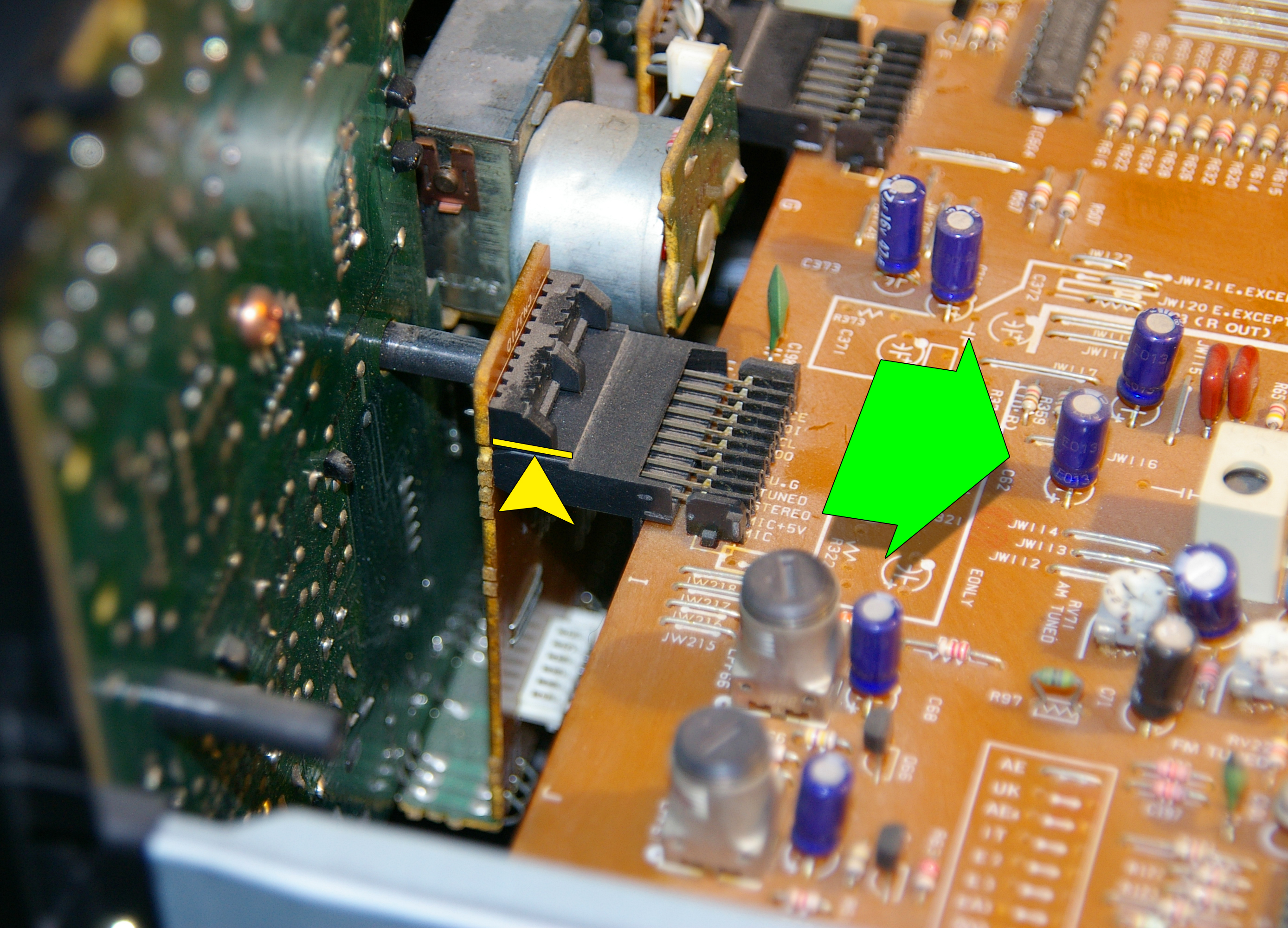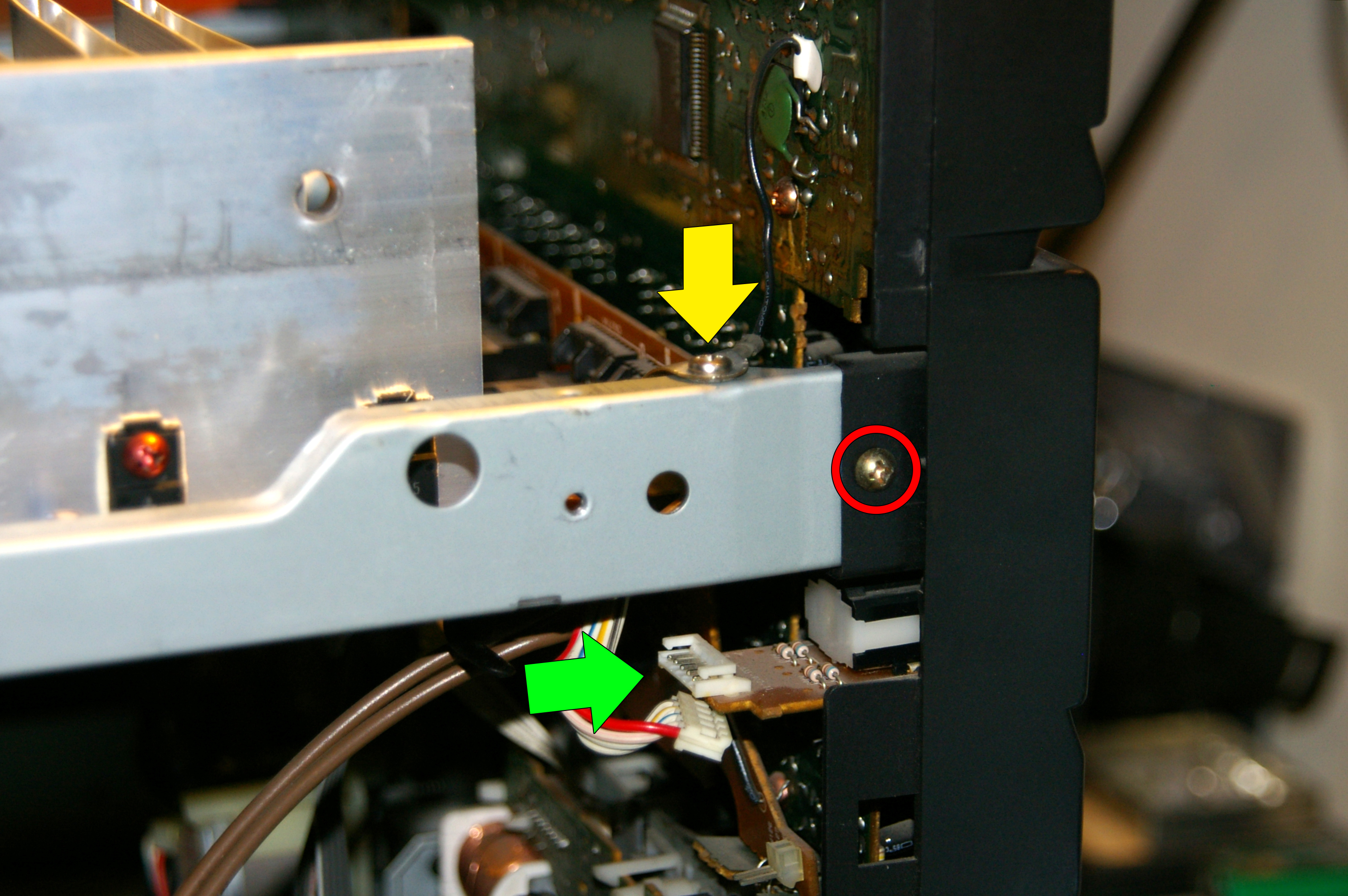 Ahora voy a sacar la placa principal. Para ello quito los 2 tornillos (uno a cada lado) que la mantienen anclada al panel frontal. También desconecto el cable de la salida de auriculares y saco el tornillo de masa indicado con la flecha amarilla.