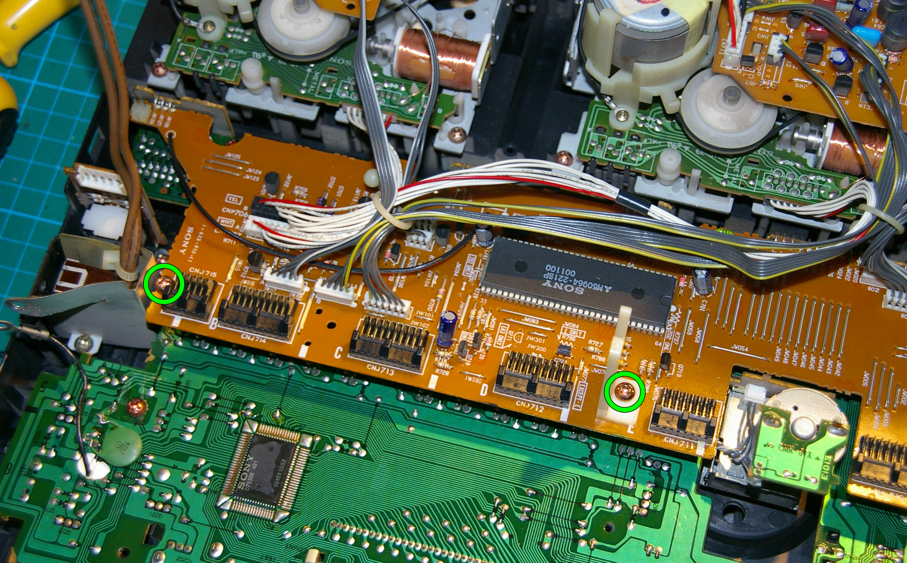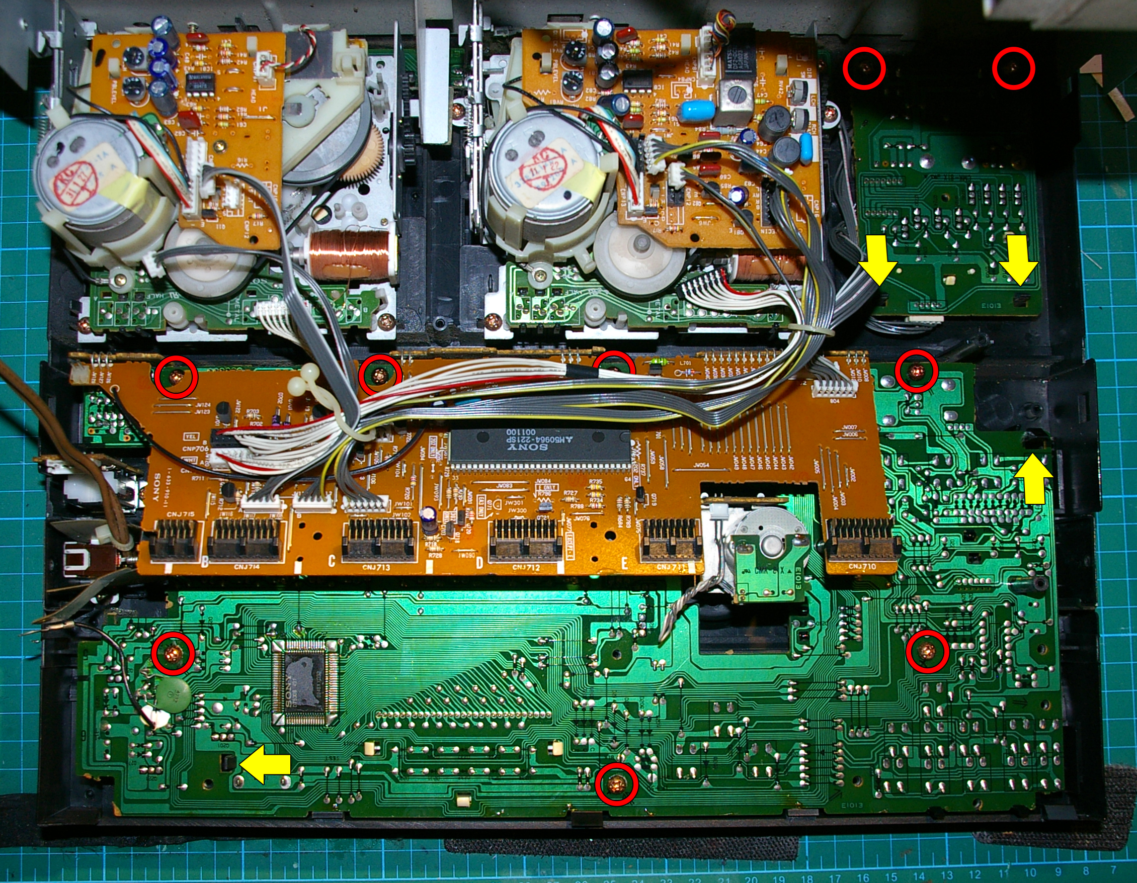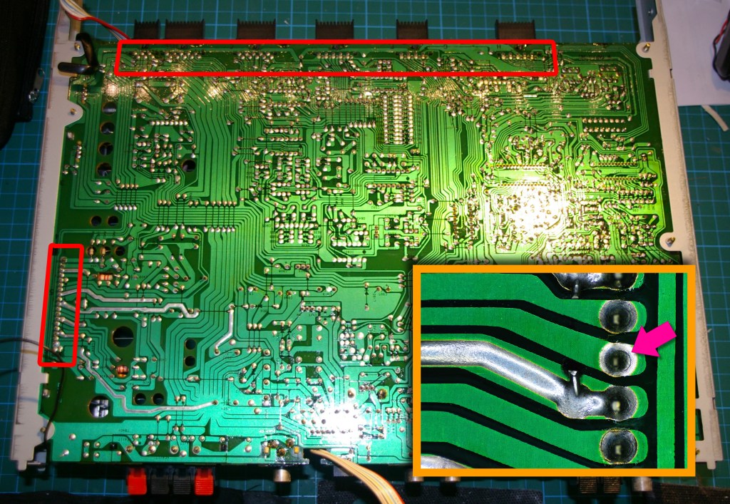 En la placa principal reviso sobre todo las soldaduras. Los equipos Sony de los años 80 y 90 tienen muchos problemas de soldaduras frías, máxime en la etapa de amplificación. Pronto observo algunas de ellas, que vistas bajo el microscopio revelan la necesidad de repararlas urgentemente. En la siguiente imagen he marcado en rojo las zonas más susceptibles de fallo por soldaduras en mal estado: conectores y amplificador de audio.