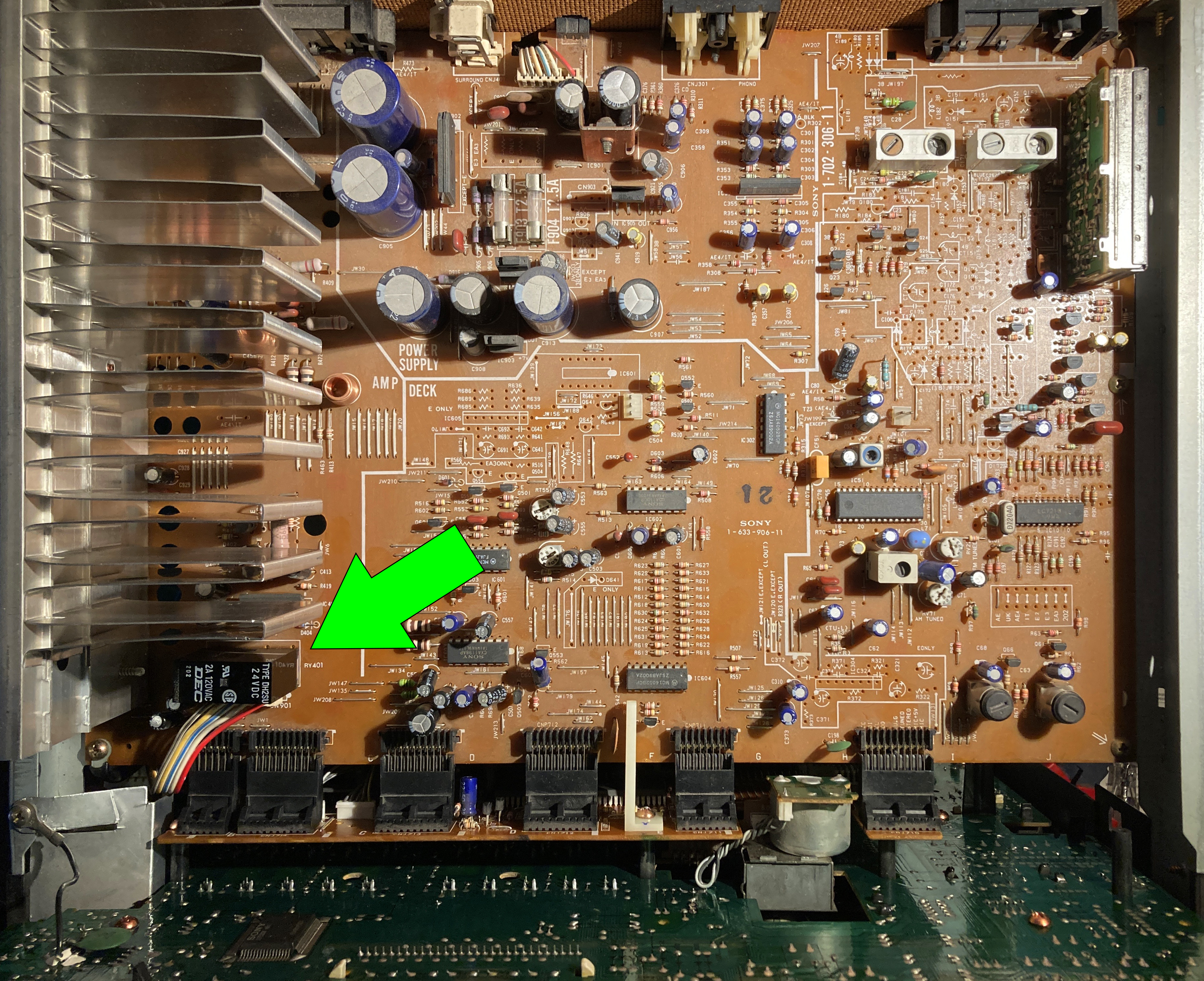 Muchos de estos fallos típicos se deben a un mal funcionamiento del relé de salida de audio. En este equipo lo localizaremos rápidamente al quitar la tapa superior. Como se ve en la fotografía siguiente el relé está ubicado a la izquierda, cerca del radiador del amplificador de audio.