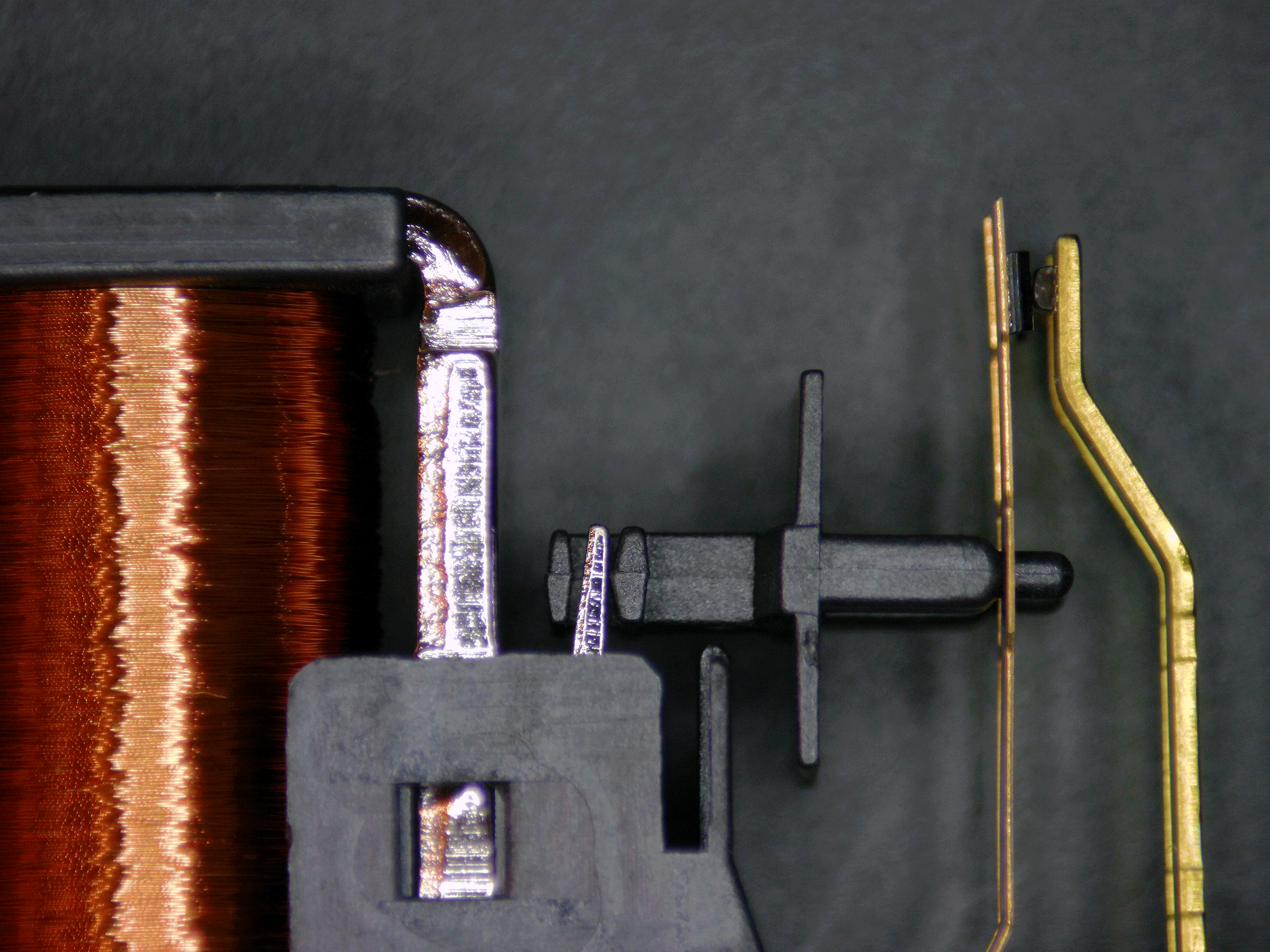 Mediante las pestañas laterales podemos abrir la cápsula externa para limpiar los contactos. Se pueden lijar suavemente o bien introducir el relé abierto en un limpiador por ultrasonidos durante 10 o 15 minutos a una temperatura de 40 grados. La siguiente animación muestra cómo funciona el relé cuando se activa. A la derecha, los contactos se cierran para permitir el paso de la señal. Son estos contactos los que deben limpiarse para que el sistema vuelva a funcionar de nuevo.