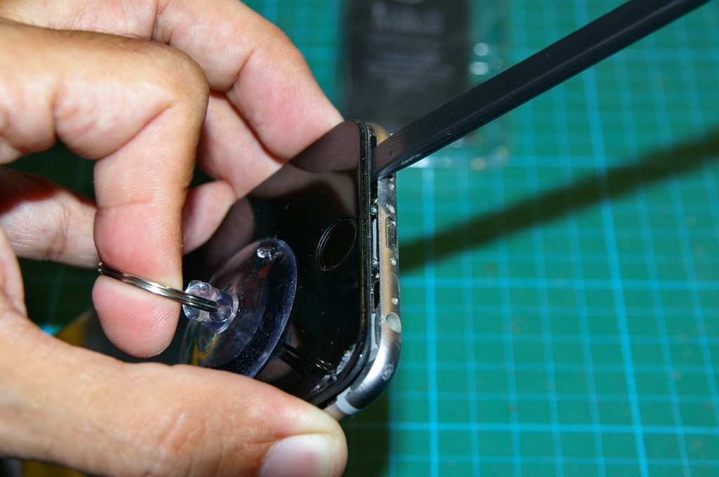 A continuación aplico una ventosa de extracción en la parte inferior de la pantalla para tirar de ella, y con una herramienta plástica de apertura voy haciendo palanca cuidadosamente mientras la pantalla se separa del chasis. Tengo que ir poniendo la pantalla en posición vertical sin separarla de su borde superior, ya que es ahí donde están las dos pestañas que hacen de bisagra.