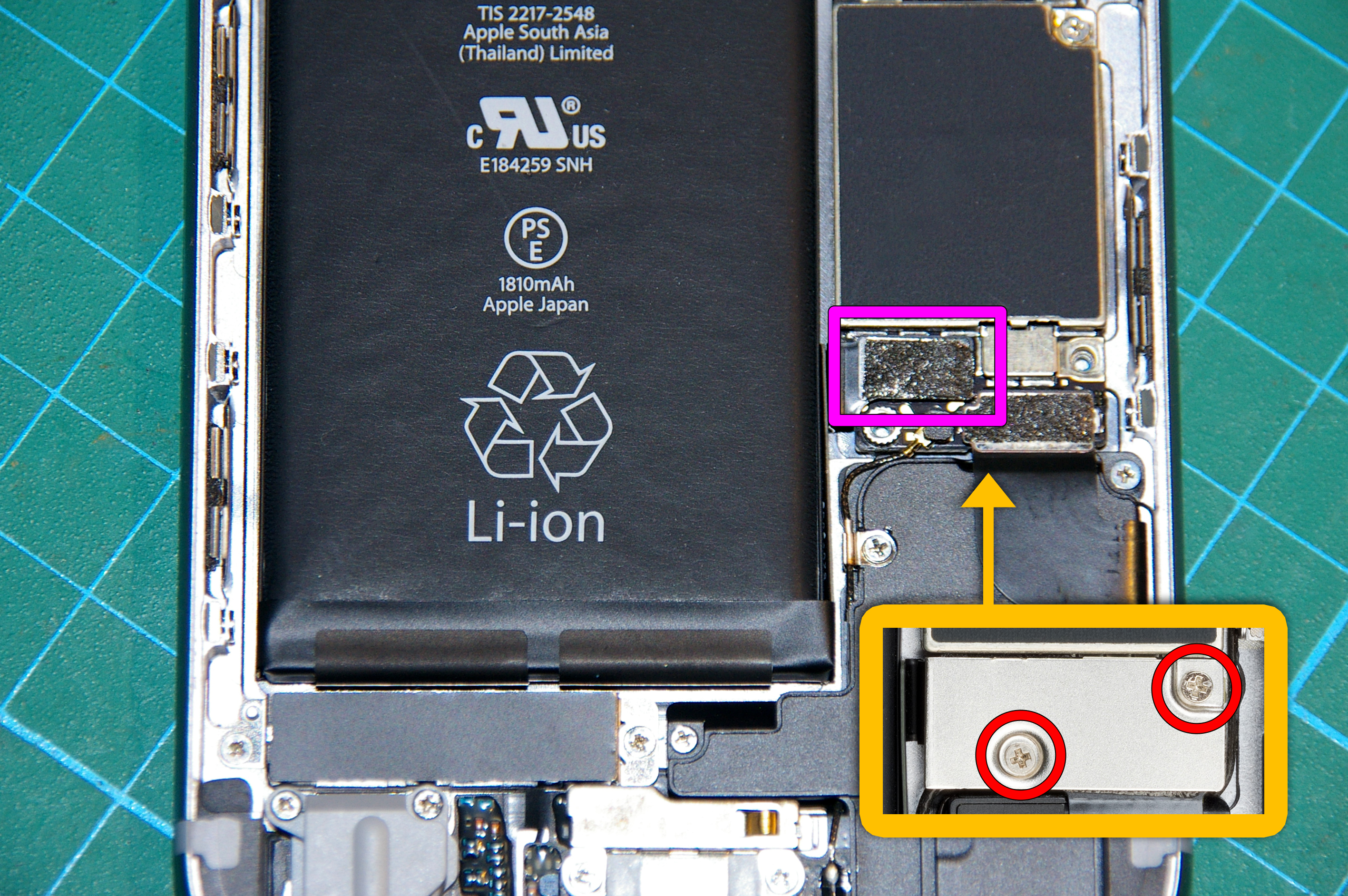 Una vez abierto el iPhone 6 procedo a desconectar la batería, quitando la chapa de protección indicada en la imagen inferior y retirando con cuidado el conector marcado en magenta con una herramienta de plástico.
