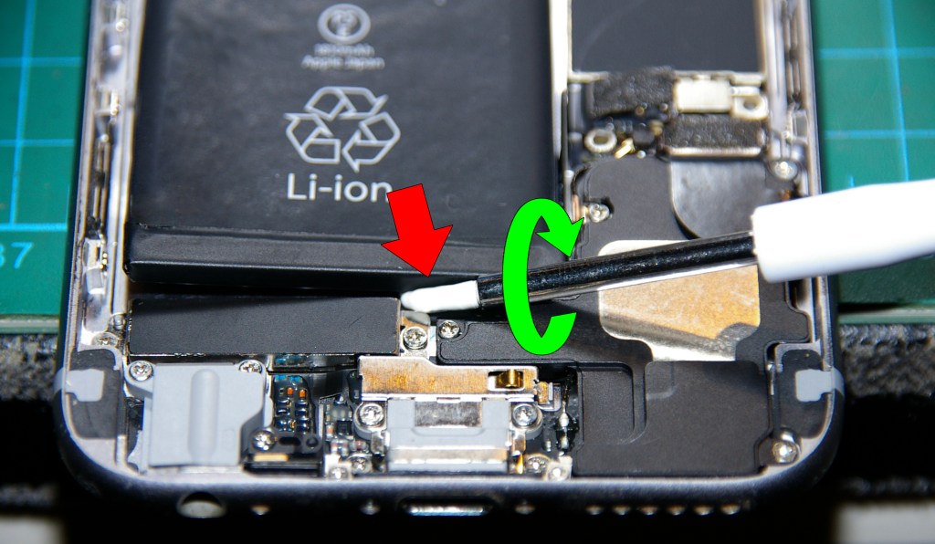 En este momento puedo ir retirando el extremo de las tiras adhesivas que mantienen la batería original pegada al chasis. Uso una herramienta de plástico fina. La idea es descubrir la parte adhesiva final de forma que pueda ser enrollada a un destornillador, por tanto hay que vigilar que no se quede pegada sobre sí misma.