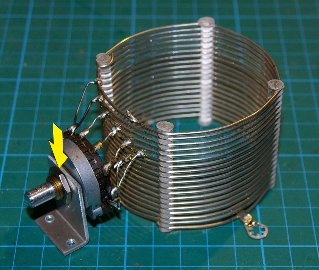 Acto seguido procedo a desoldar el terminal indicado en amarillo en la imagen inferior y desacoplo el eje del mando «Inductance». Antes de hacerlo lo he colocado en la posición «A».