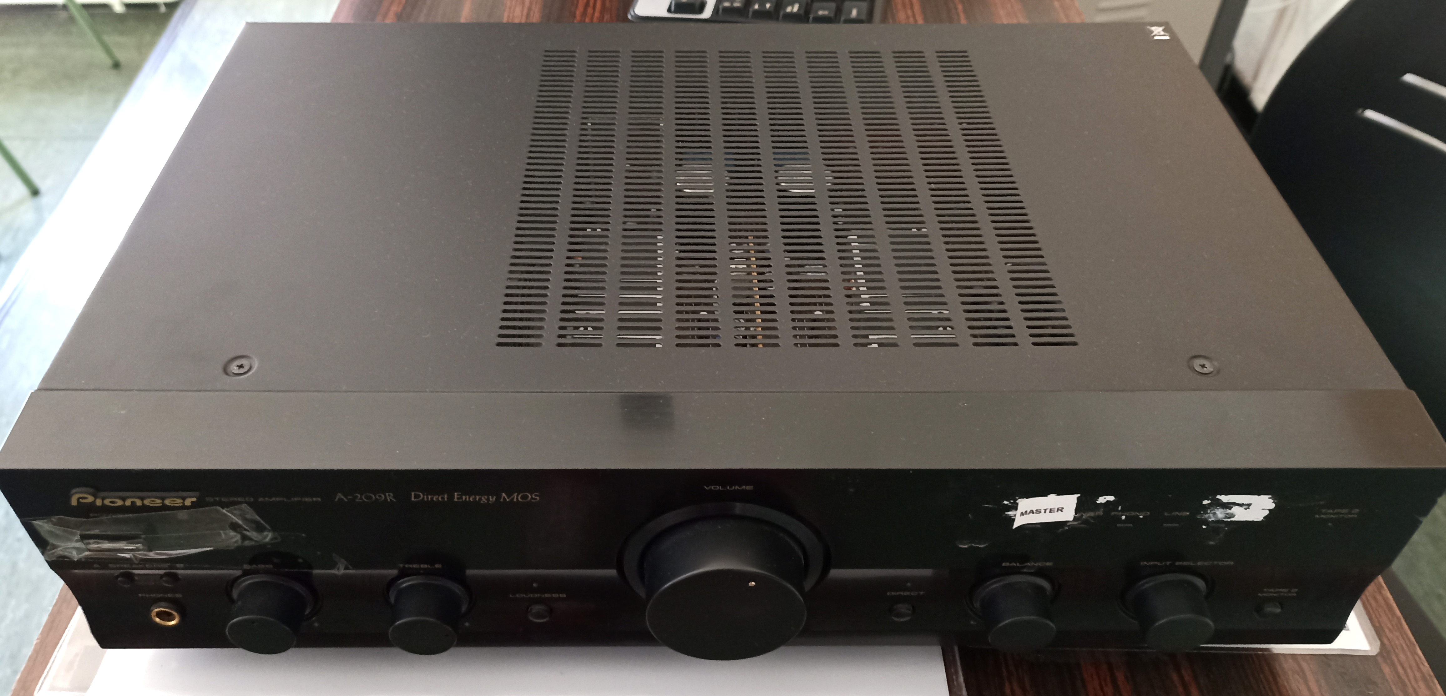 Un amplificador Hifi clásico, el Pioneer A-209R. Esta unidad tiene un problema en el interruptor de encendido, que ha quedado bloqueado en la posición «Off». A menudo esto se debe a que se ha partido el resorte interno que alterna el enclavamiento entre ambas posiciones. El usuario ha procedido a poner cinta adhesiva en el botón para dejarlo siempre conectado.