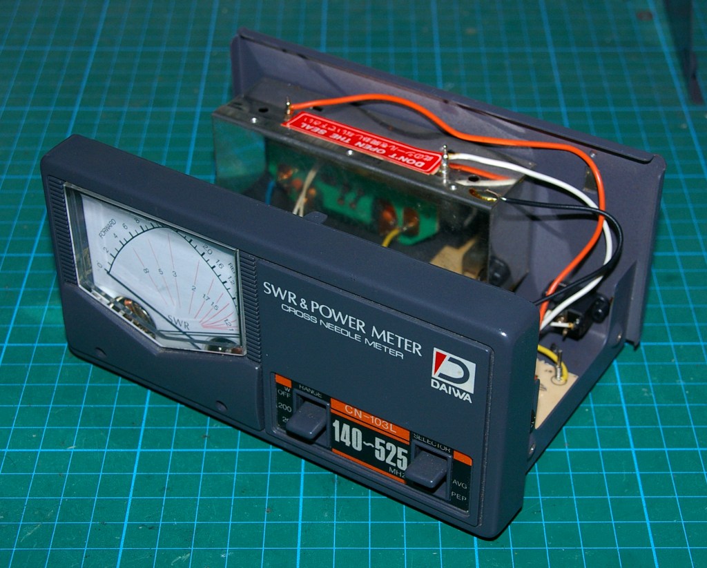 Medidor de ondas estacionarias y potencia de RF de doble aguja que tiene el indicador sin luz. Procedo a abrirlo para hacer el cambio de la bombilla. Quito para ello los 2 tornillos de los laterales.