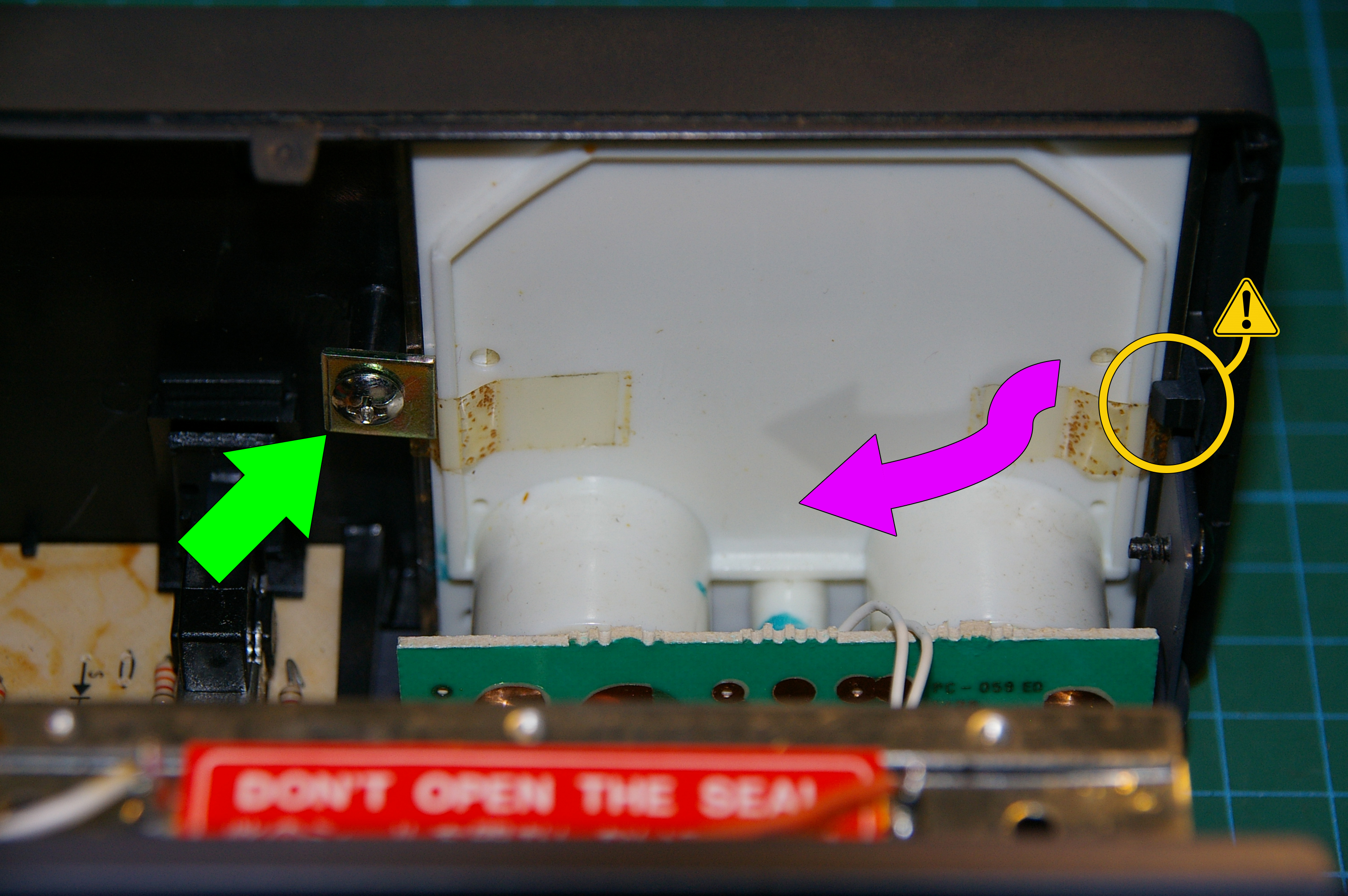Con el indicador fuera de su ubicación procedo a desmontar la tapa frontal, retirando las cintas adhesivas de los laterales (flechas amarilla en la siguiente foto) y abatiéndola de abajo a arriba. Aquí presto especial atención de no tocar los elementos móviles para no dañarlos ni descalibrarlos. Tengo acceso a la bombilla, la cual puedo empujar para que salga hacia atrás. La subtituyo.