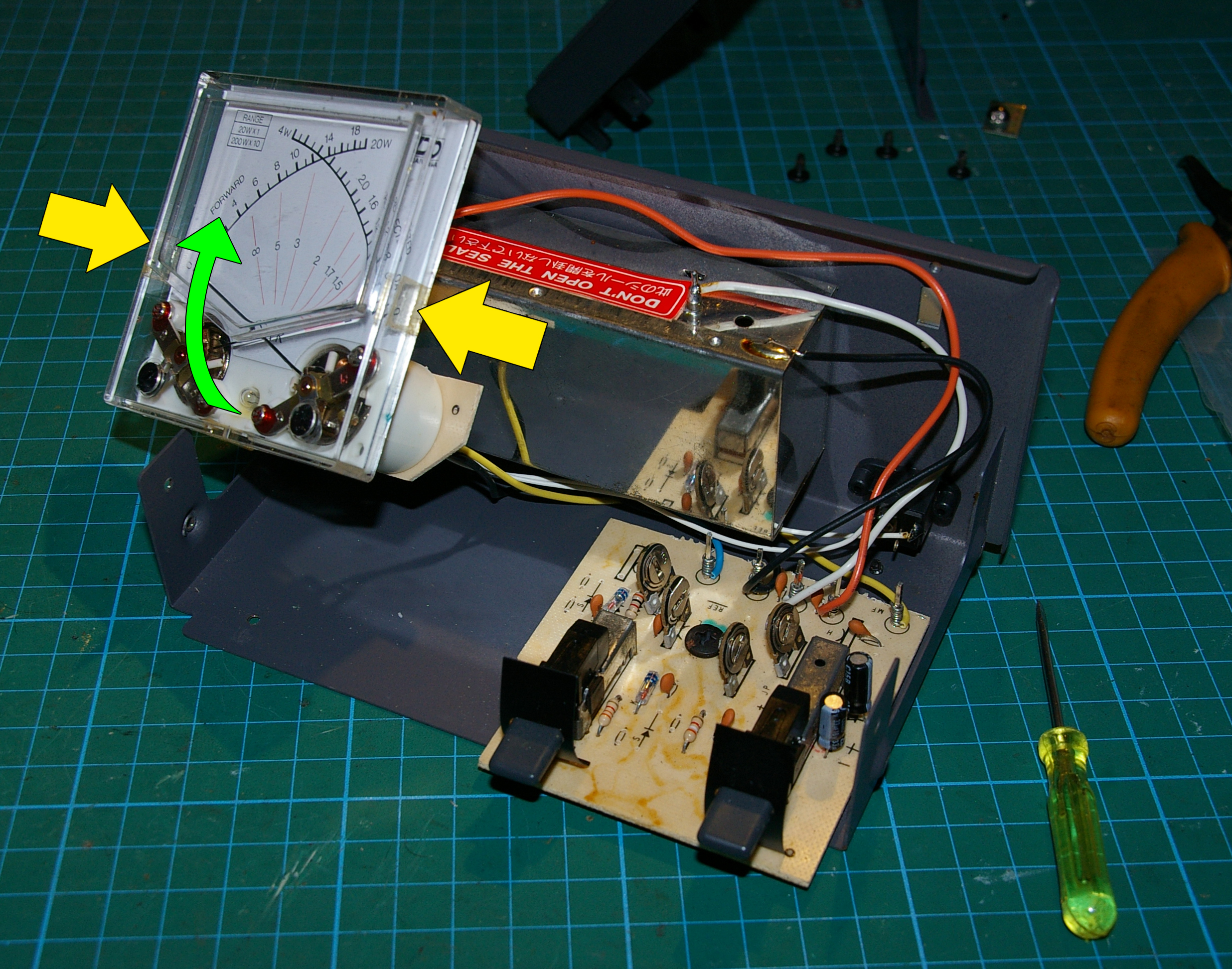 Nota sobre el montaje: resultó inviable el uso de tiras Led porque hacían sombras en el indicador. Opté por instalar una lámpara de 12V / 60mA, con un brillo no demasiado evidente, pero que mantendrá una temperatura suficientemente baja como para no variar la calibración de las agujas. El medidor se monta siguiendo el orden inverso al desmontaje.