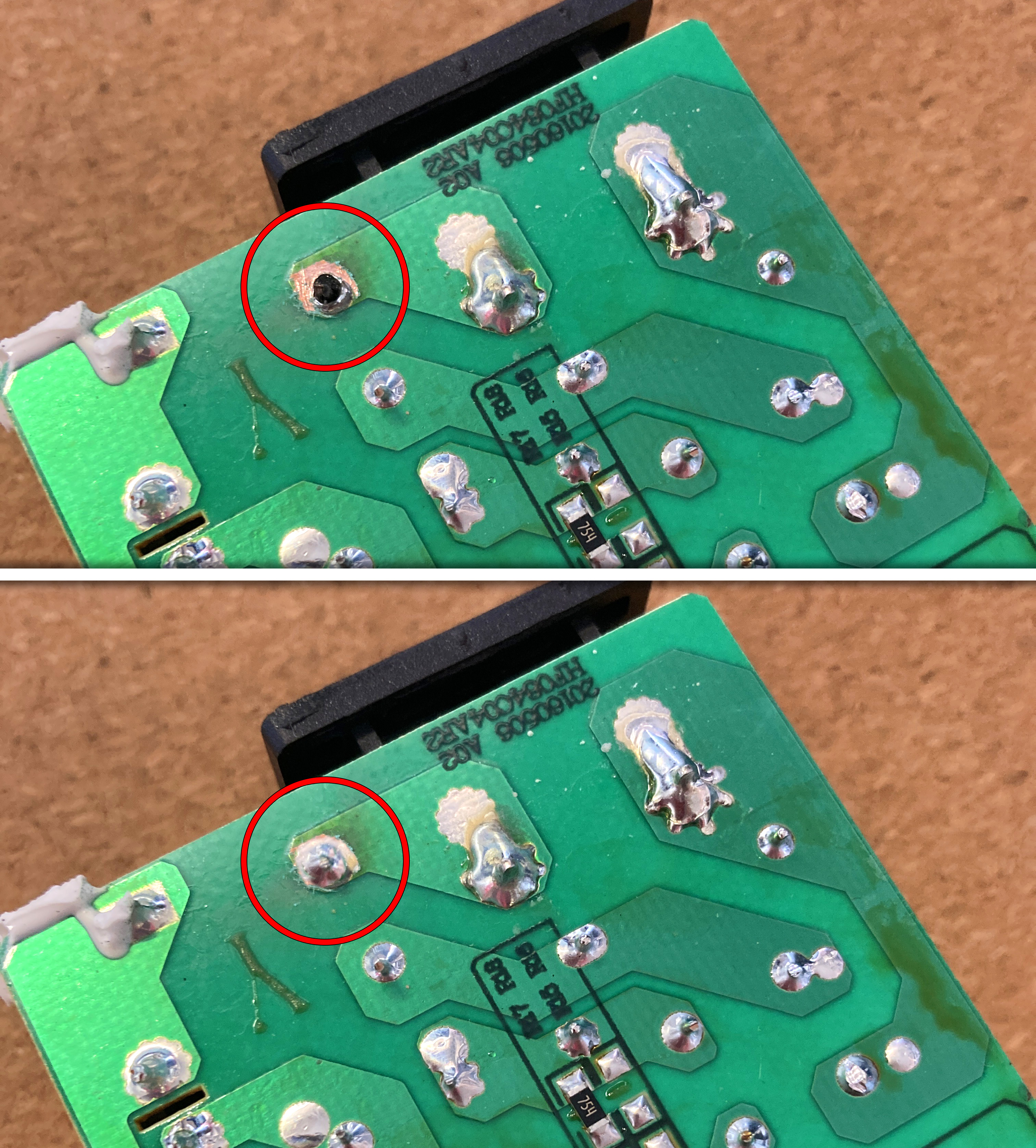 Para reparar la soldadura elimino los restos de carbonilla del fusible. Luego procedo a eliminar parte del barniz en el pad de soldadura con la idea de ampliar el tamaño del mismo (siguiente imagen, foto superior). Realizo la soldadura correspondiente (imagen inferior).