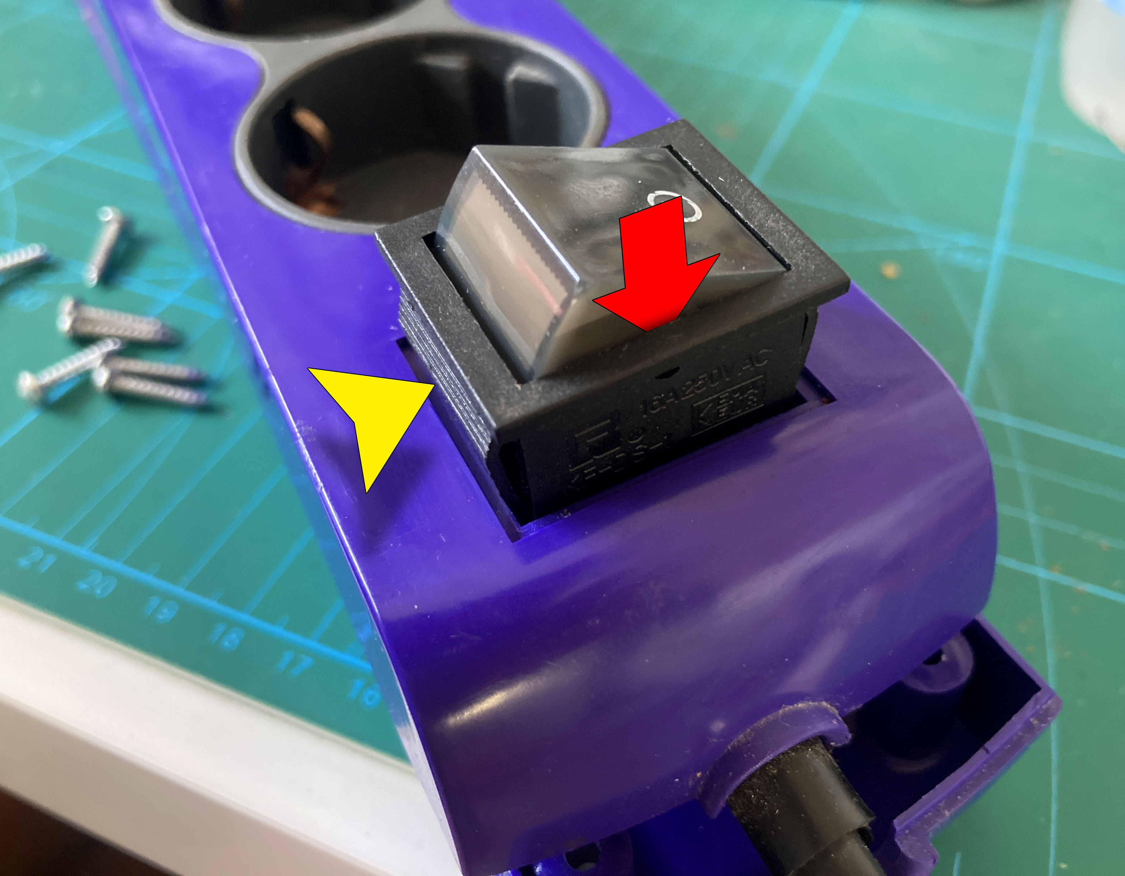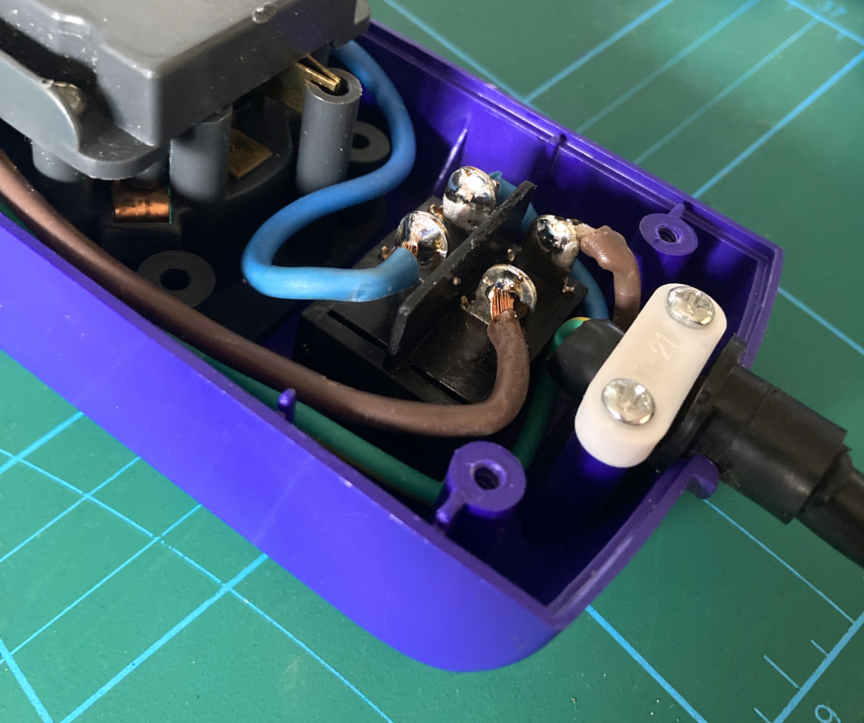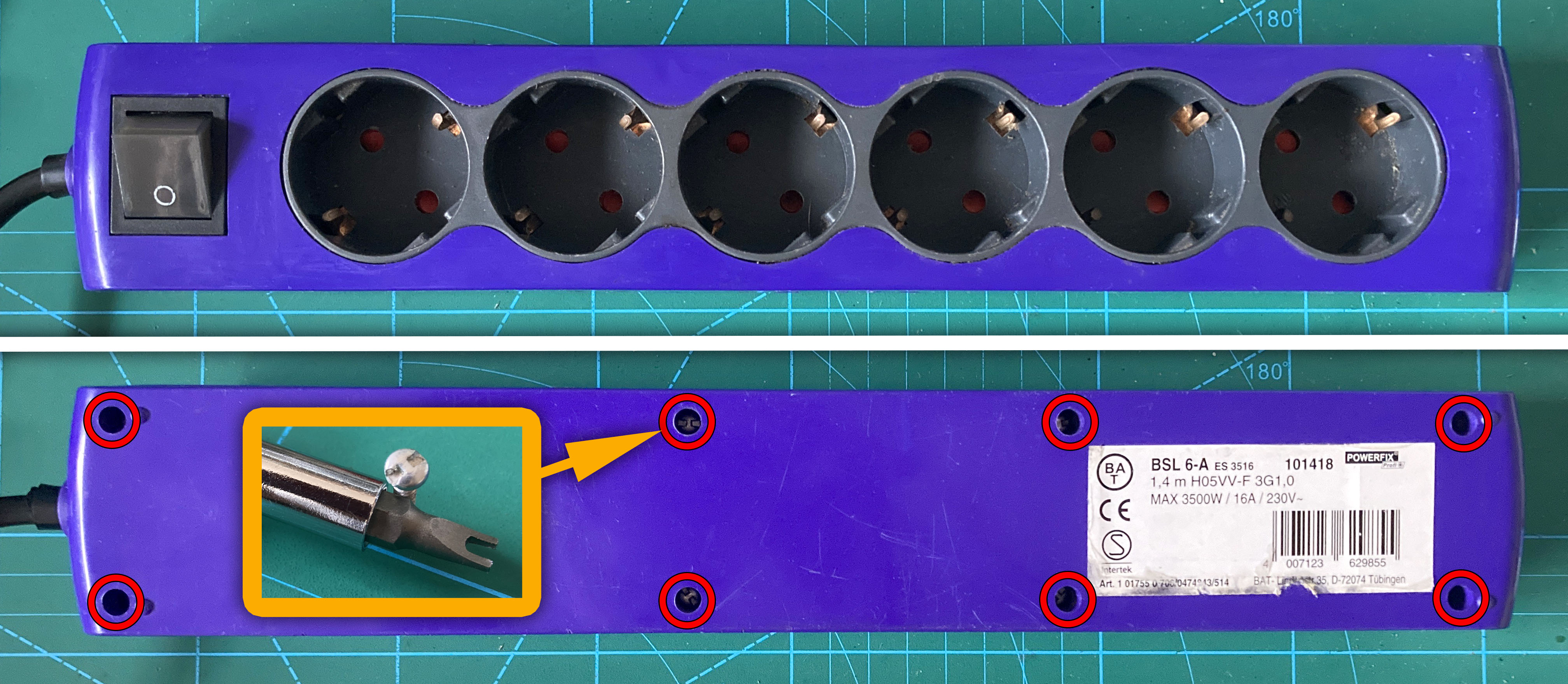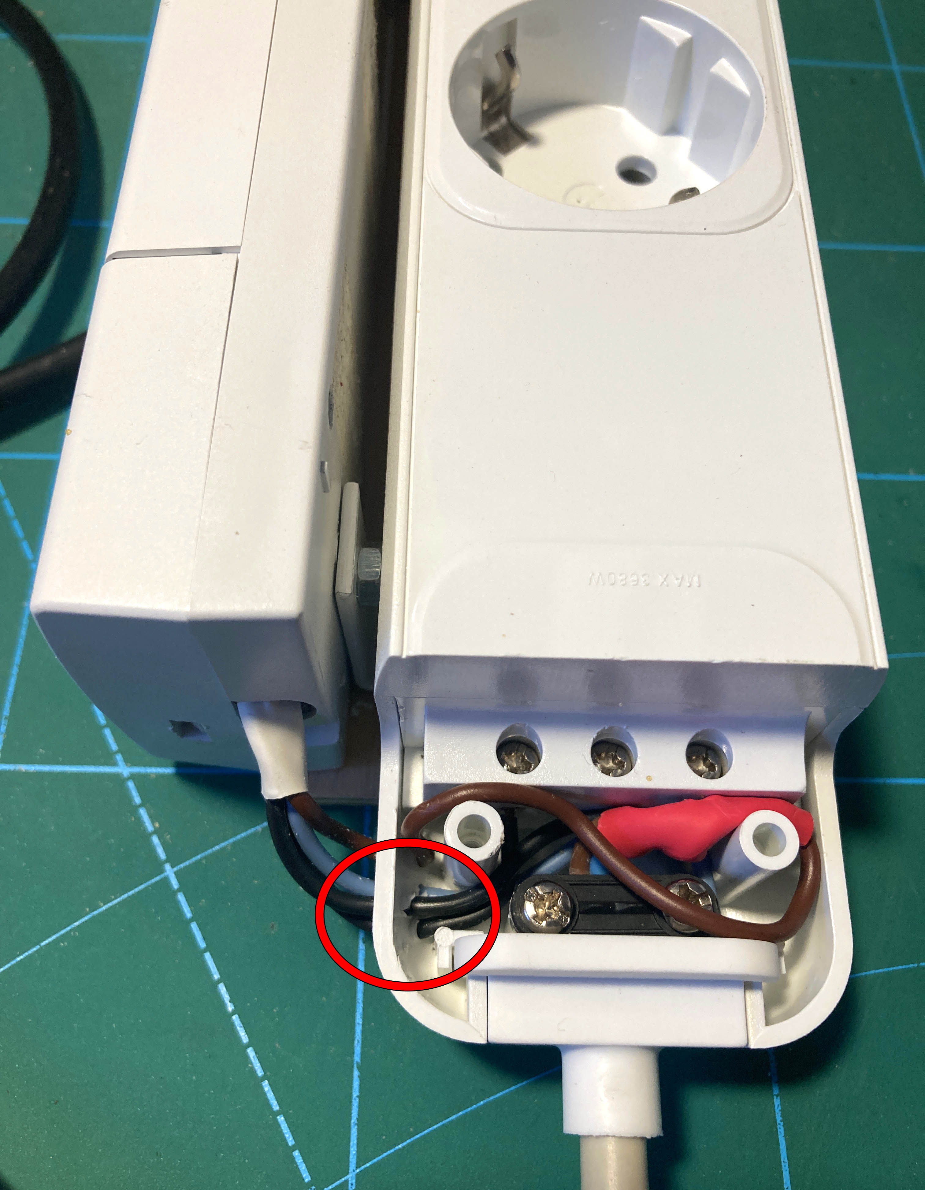 A continuación acoplo los dos dispositivos. He elegido una regleta Famatel de buena calidad con tres tomas y sin interruptor. En uno de sus laterales he practicado unos orificios para pasar los cables del receptor, que voy conectando conforme al esquema visto anteriormente.