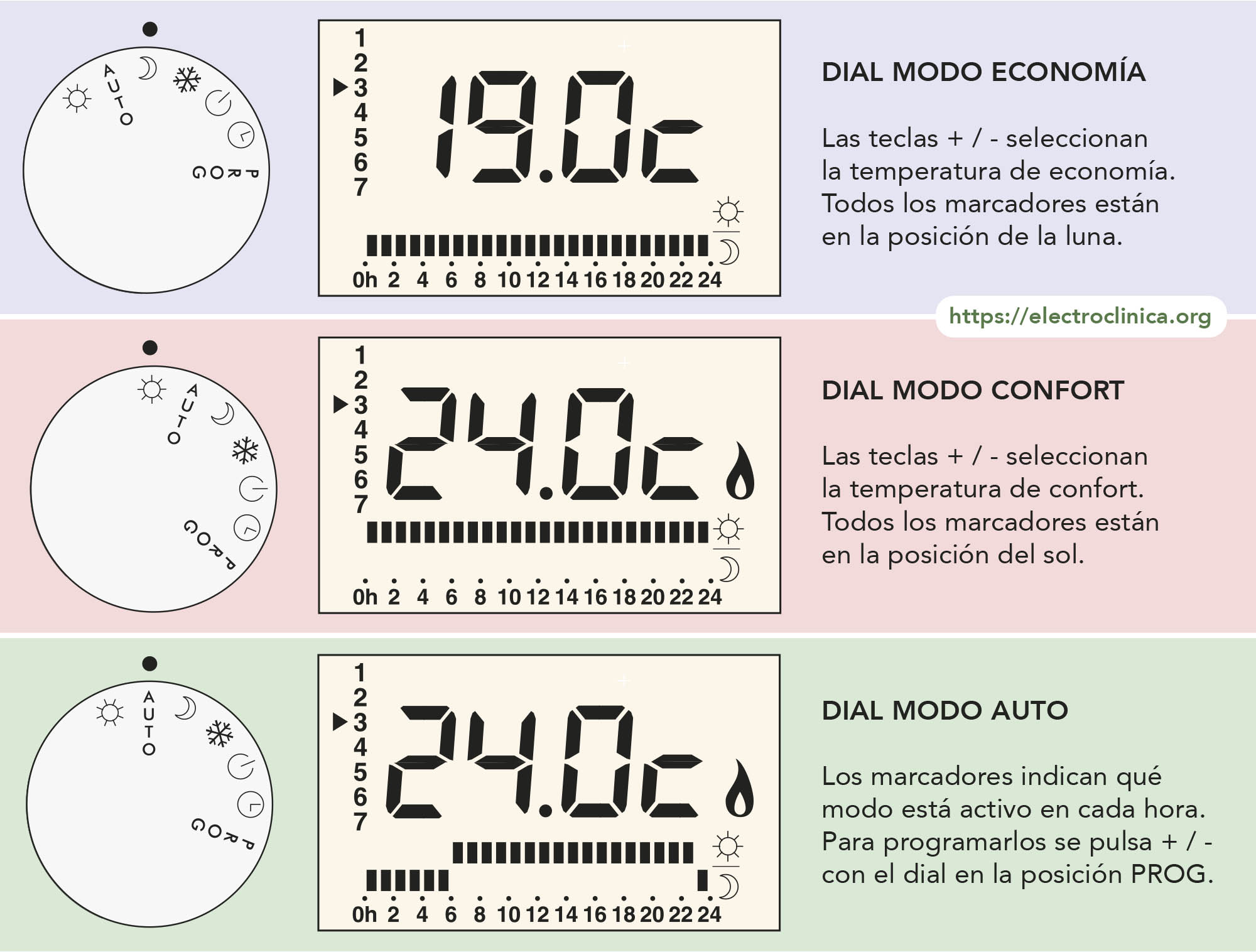 Establece la temperatura de funcionamiento adecuada para cuando estamos en casa. El dial se pone en la posición del sol y con las teclas +/- seleccionamos la temperatura.