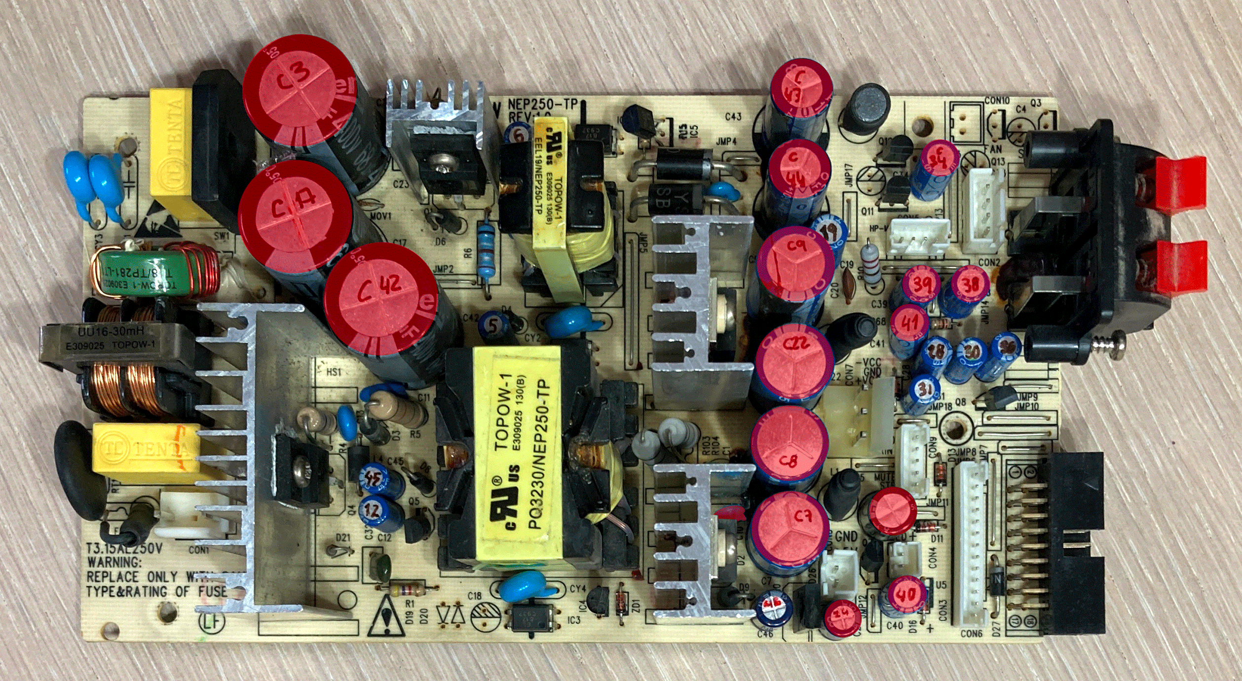 A continuación hago un mantenimiento correctivo y preventivo de los condensadores de la fuente. Las salidas de alimentación mal filtradas pueden generar numerosos problemas y se trata de minimizarlos. La siguiente animación muestra los condensadores que voy a substituir, algunos de ellos muy deteriorados e incluso hinchados.