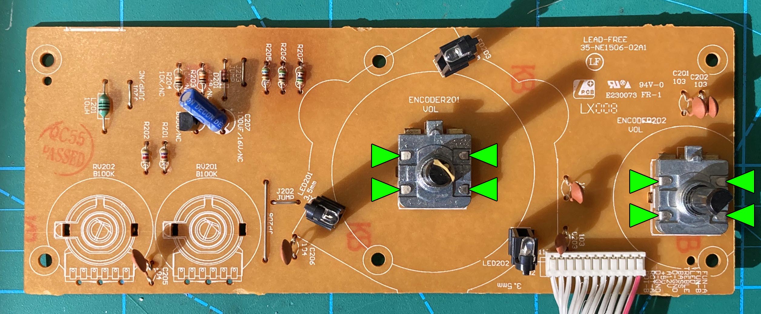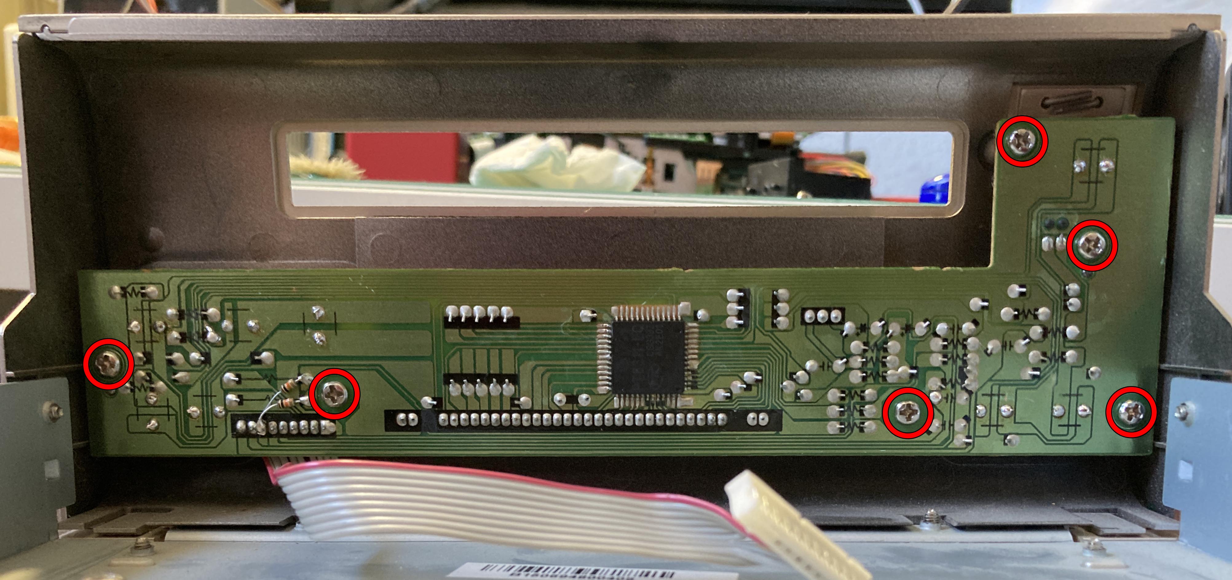 Una vez hecho el mantenimiento de la fuente me centro en los encoders. Tengo que desmontar la placa del panel frontal. Quito primeramente sus 6 tornillos y luego desueldo los contactos marcados en rojo en la siguiente fotografía.