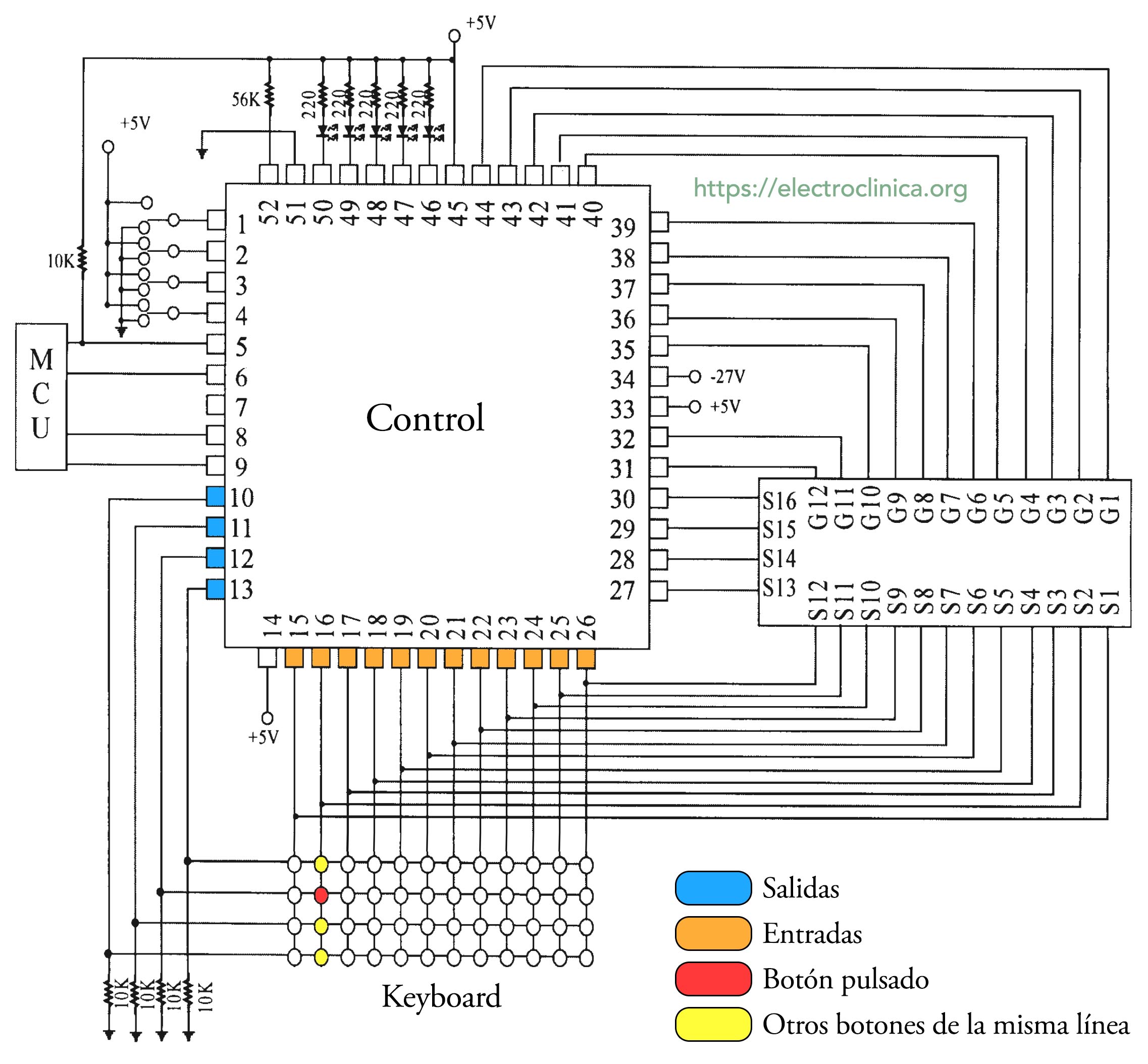 ¿Por qué se genera este problema de aleatoriedad en las órdenes de la botonera de un equipo? En el siguiente esquema puede verse un conexionado típico de una botonera matricial a un chip controlador.