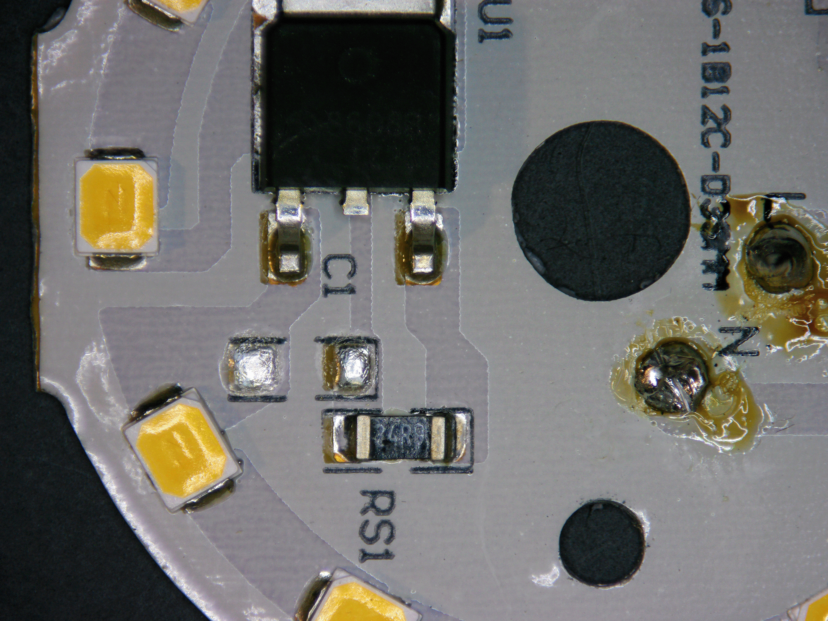 Cierro la bombilla y la pruebo. No se manifiesta el problema. Muy probablemente el calor generado por los leds se transmite al circuito impreso, montado sobre una delgada placa de aluminio sin disipador. Ese calor hace que la resistencia acabe fallando, aumentando considerablemente su valor. Dicho cambio es interpretado por el integrado como la necesidad de entregar menos intensidad a los leds, que disminuyen su luminosidad surgiendo el problema. Como conclusión, se debe a un fallo de diseño consistente en dos problemas: no usar disipador para abaratar costes y forzar extremadamente el régimen de trabajo de los leds, lo cual les acorta la vida y hace que generen más calor. Como nota adicional se puede usar un valor de resistencia algo más alto, como 33 ohmios. Si se sube más el valor, la curva de intensidad bajará muchísimo.