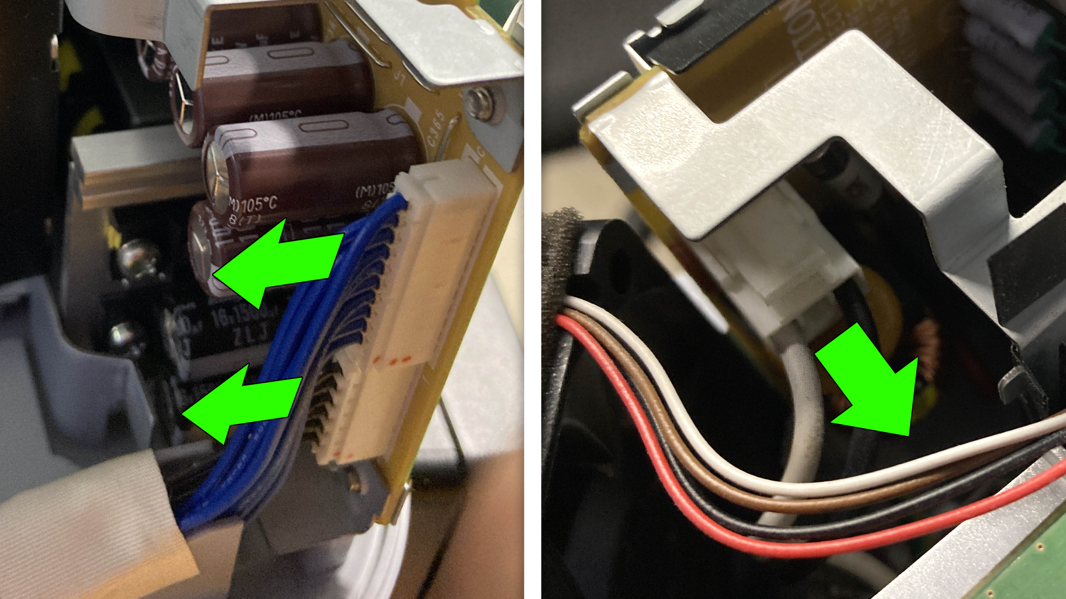 Desconecto la fuente de alimentación tirando de los conectores, como se indica en la imagen siguiente. El conector de entrada de tensión tiene un clip que hay que presionar para que salga.