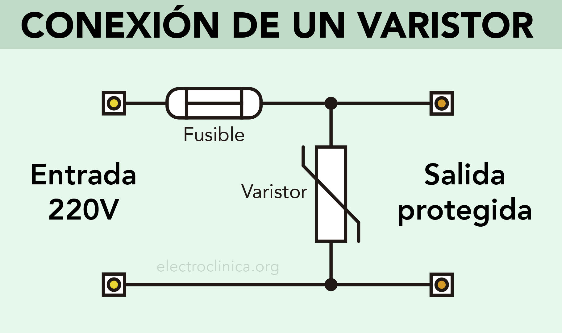 Dicha protección es muy efectiva en casos de sobretensión, ya que el equipo queda protegido gracias al “sacrificio” del varistor, que quedará inservible. En el siguiente esquema puede verse cómo se conecta un varistor para que proteja a un equipo mediante un fusible. Al subir la tensión fuera de los límites esperados el varistor baja instantáneamente su resistencia hasta quedar en corto, lo cual aumenta muchísimo la intensidad, hecho que hará que se funda el fusible. Esto interrumpirá el suministro eléctrico a todo el equipo.
