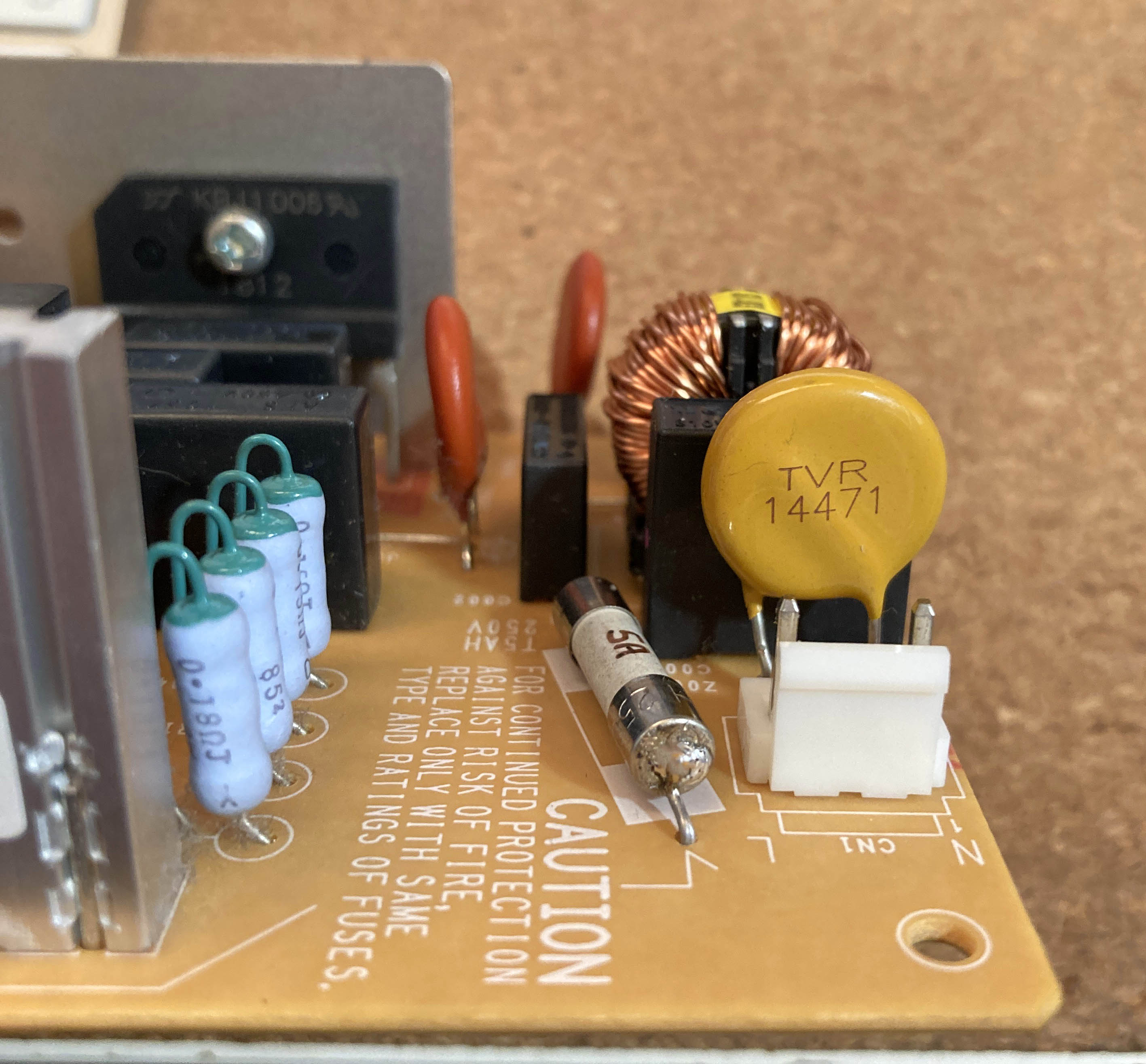 El varistor quemado es un TVR-10471 (470V). Lo substituyo por otro de 450V. En cuanto al fusible, es de 5 amperios y de fusión rápida. Pongo uno de idénticas características para mantener la seguridad del equipo dentro de las especificaciones del fabricante.