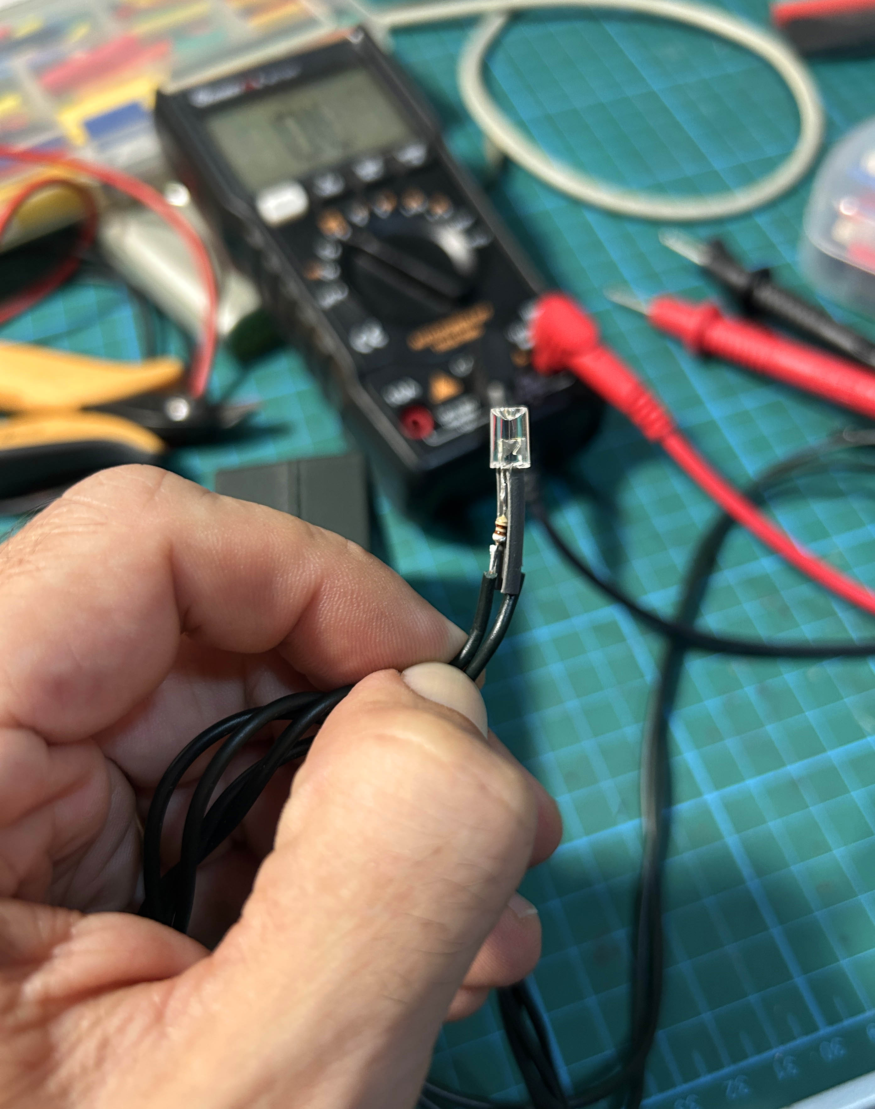 Cortando con un bisturí la cobertura plástica accedo a los contactos de uno de los leds dudosos. Los primeros leds pueden no llevar resistencia, pero el resto lleva una de 1K. Con esto se ha equilibrado el consumo del conjunto a un nivel aceptable. Si al abrir observo un led sin resistencia debo comprobarlo con un tester en modo diodos. Si además lleva resistencia, después de comprobar el led debo comprobar dicha resistencia.