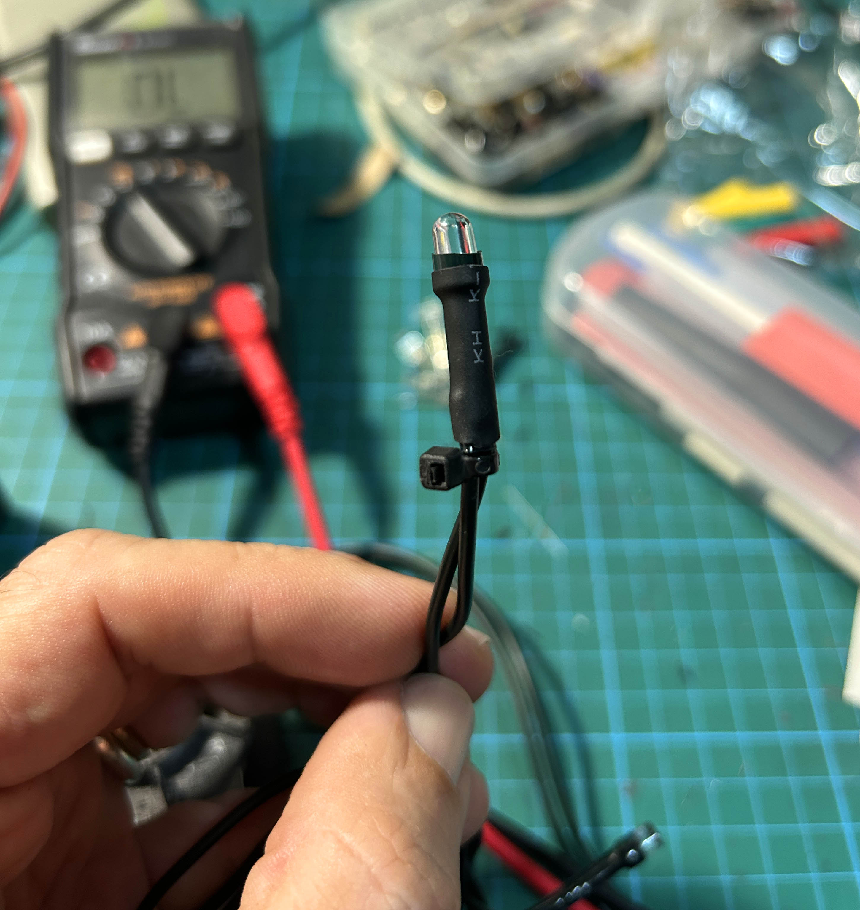 Los leds dudosos han resultado estar defectuosos. Los he cambiado por leds azules de 5mm que, si bien no son de frontal plano, servirán perfectamente para reparar este sistema de iluminación navideña. Uso termorretráctil para aislar i una pequeña brida que evite que al tirar de los cables pueda abrirse el termorretráctil. Obviamente la orientación del led ha de ser la misma que el sustituido. Para no equivocarme mi procedimiento es: desoldar el cable del cátodo y soldarlo al cátodo del led nuevo y hacer posteriormente lo mismo con el ánodo.
