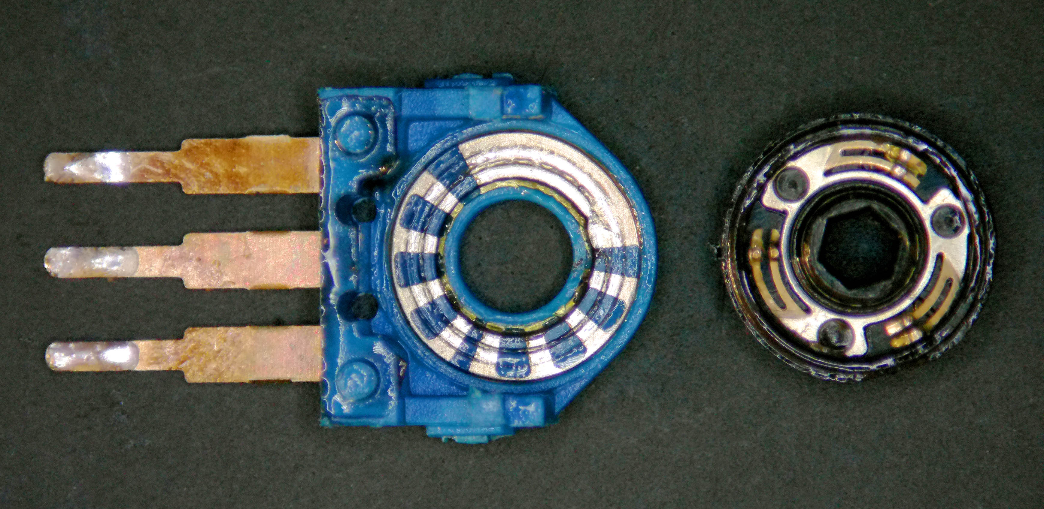 Finalmente quitamos la rueda dentada negra y tendremos acceso a los contactos eléctricos del encoder. Están llenos de grasa, como ya sospechaba antes de abrir. Bastará con hacer una limpieza profunda de dichos contactos con alcohol isopropílico, tanto en la base del encoder como en la rueda dentada.